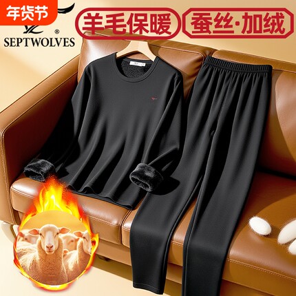 七匹狼含羊毛保暖内衣套装男桑蚕丝秋衣秋裤加绒加厚棉毛衫防风衣
