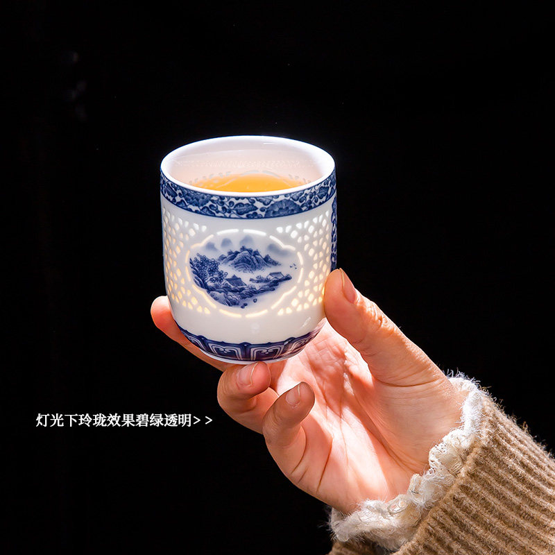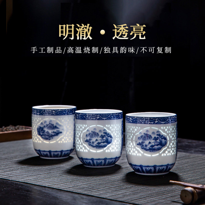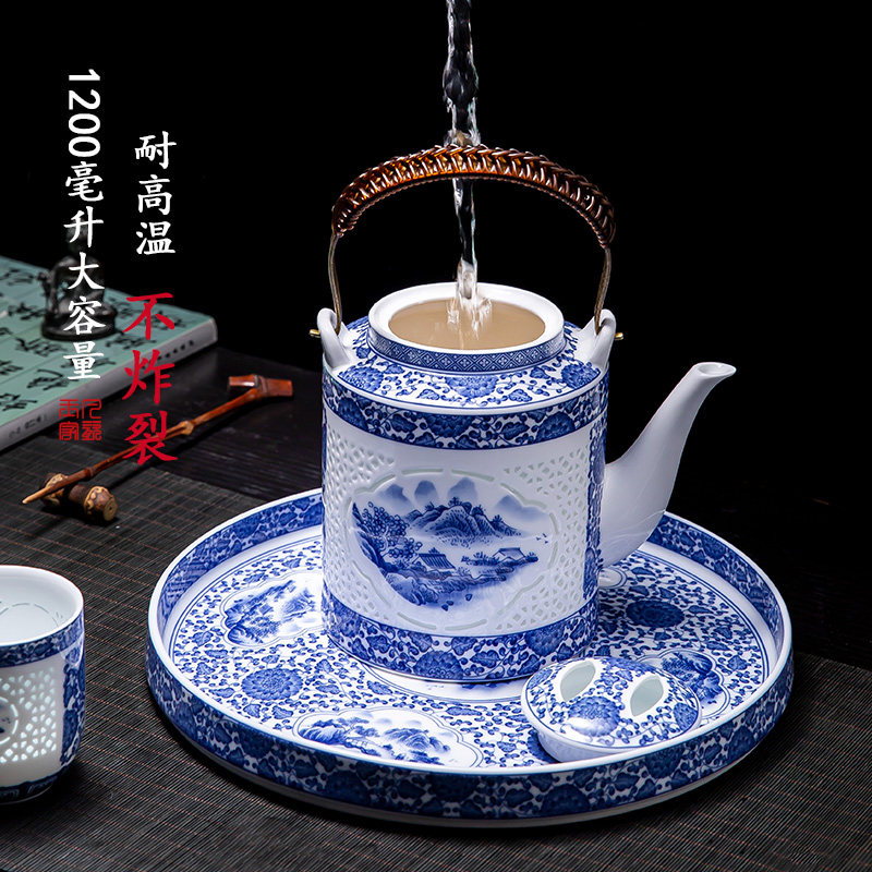 景德镇青花瓷玲珑茶具套装家用陶瓷镂空提梁壶中式复古茶杯凉水壶