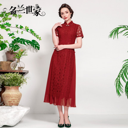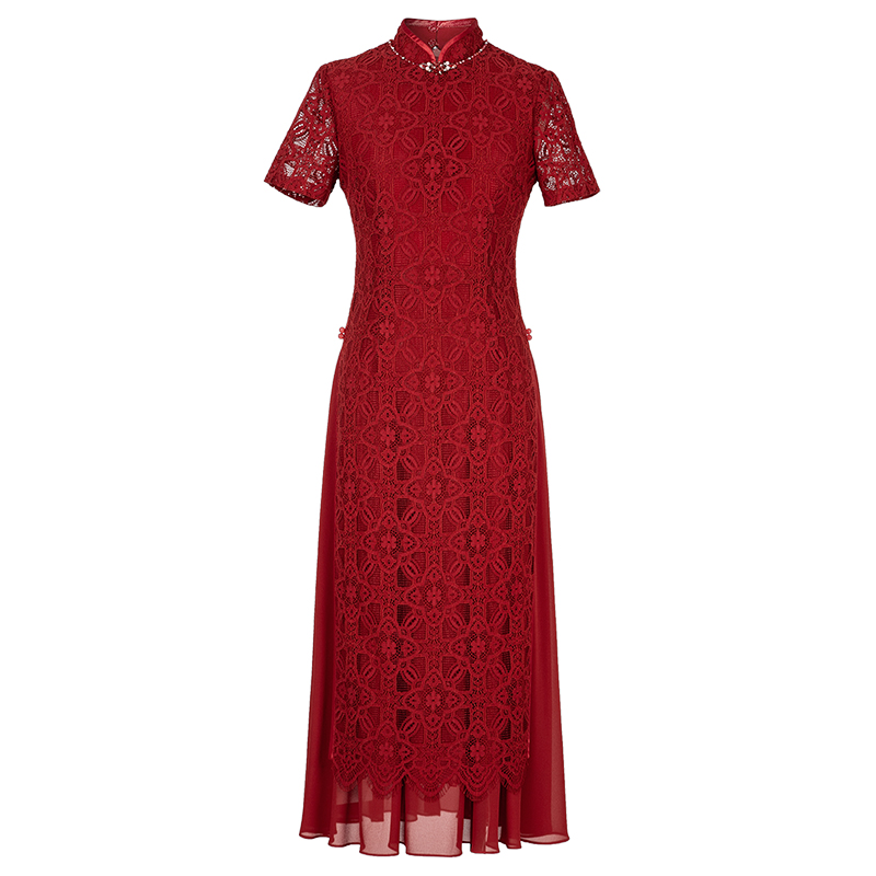 名兰世家原创新款蕾丝改良旗袍礼服女洋气立领婚宴妈妈红色连衣裙