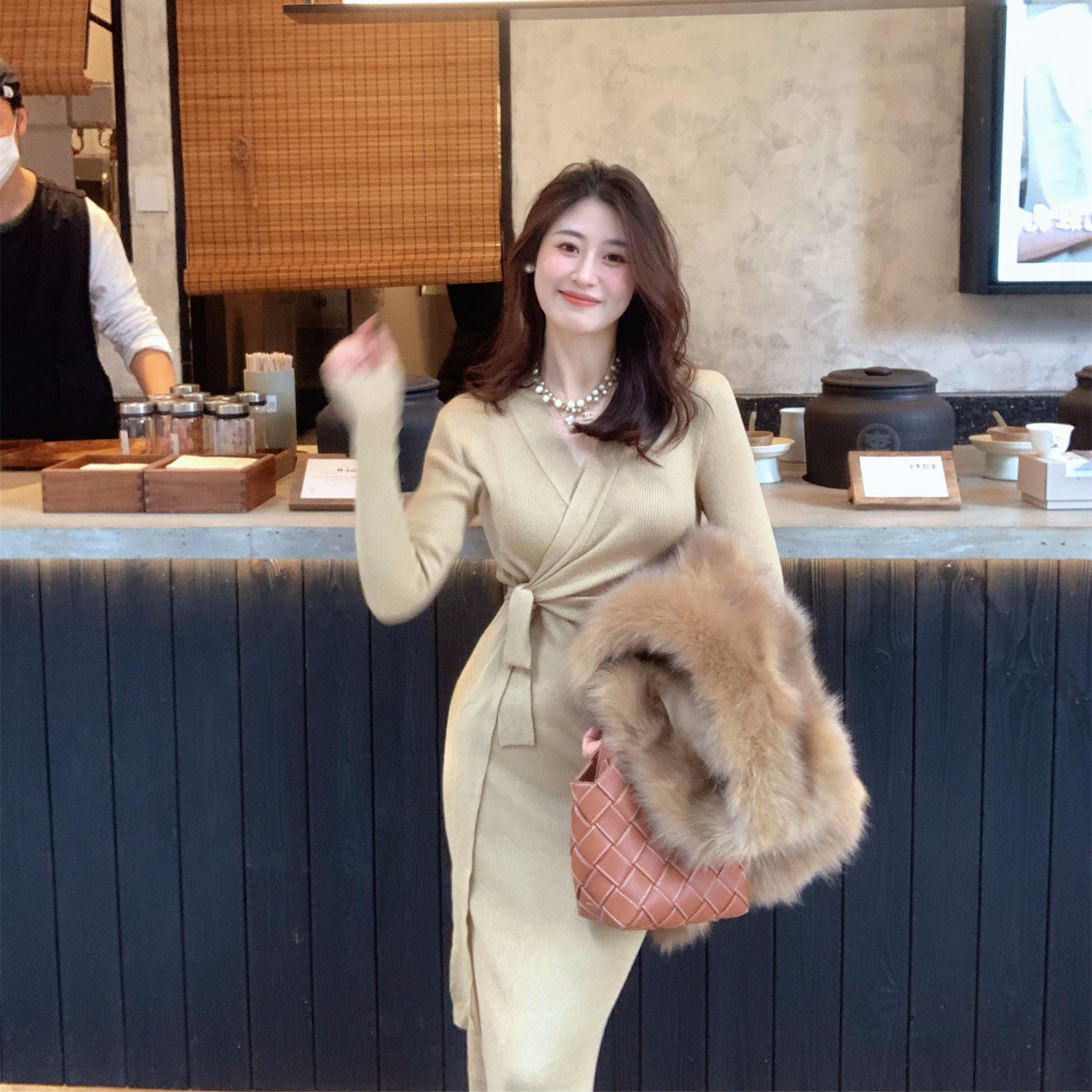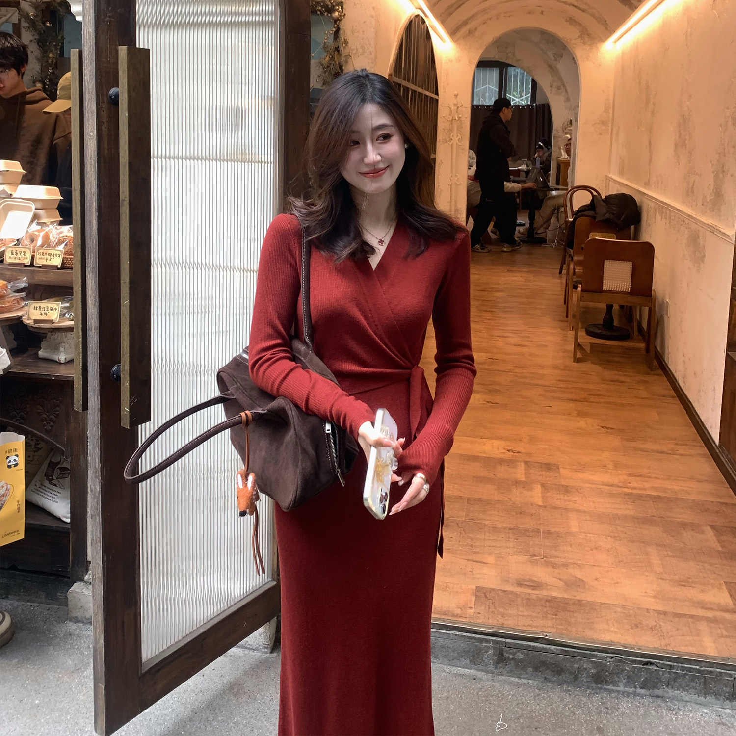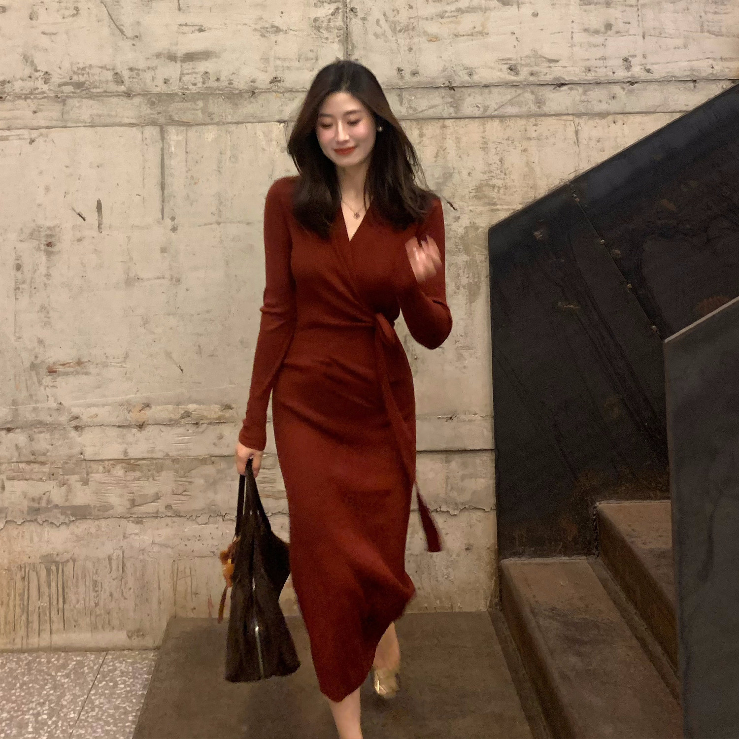 Echoone 女神裙 针织绑带连衣裙女法式优雅气质秋冬收腰长袖长裙