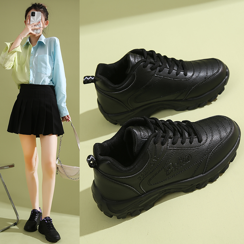 超轻软底全黑色运动鞋女秋冬季皮面防水防滑工作鞋不累脚妈妈鞋子