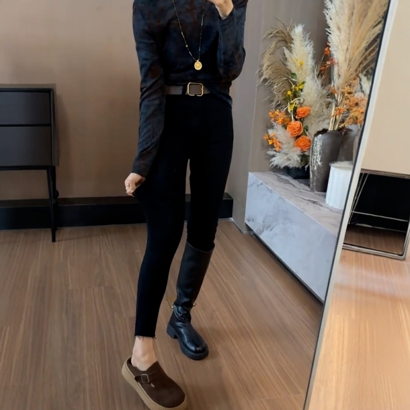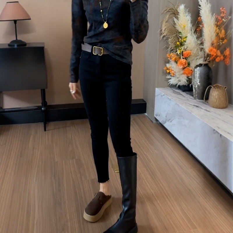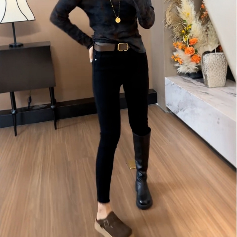 大码女2025秋季新款高腰显瘦加绒小脚牛仔裤胖妹妹紧身九分铅笔裤