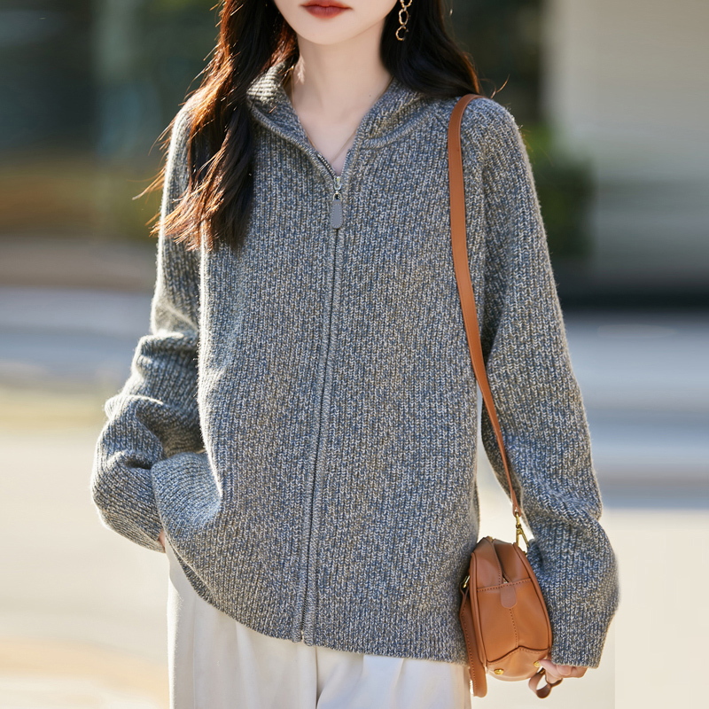 2025秋冬新款100%纯羊毛针织开衫女连帽拉链加厚宽松显瘦外套毛衣