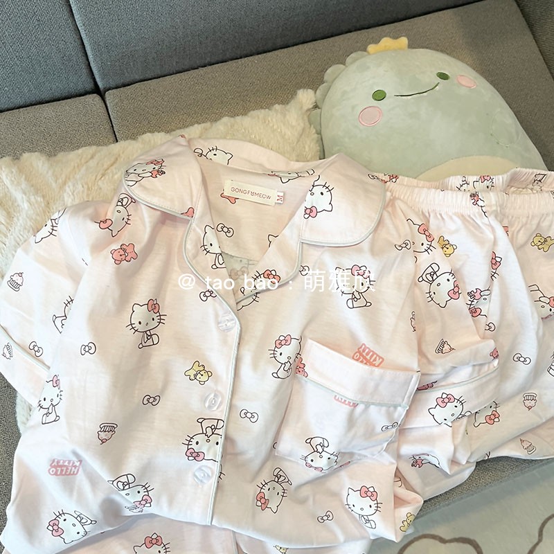 粉色KT猫睡衣女款夏季纯棉短袖短裤两件套卡通可爱少女出门家居服