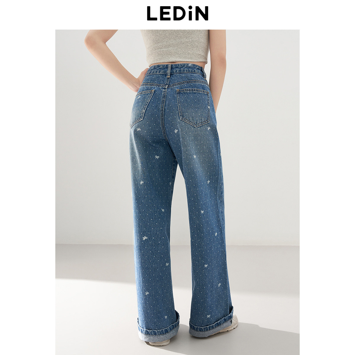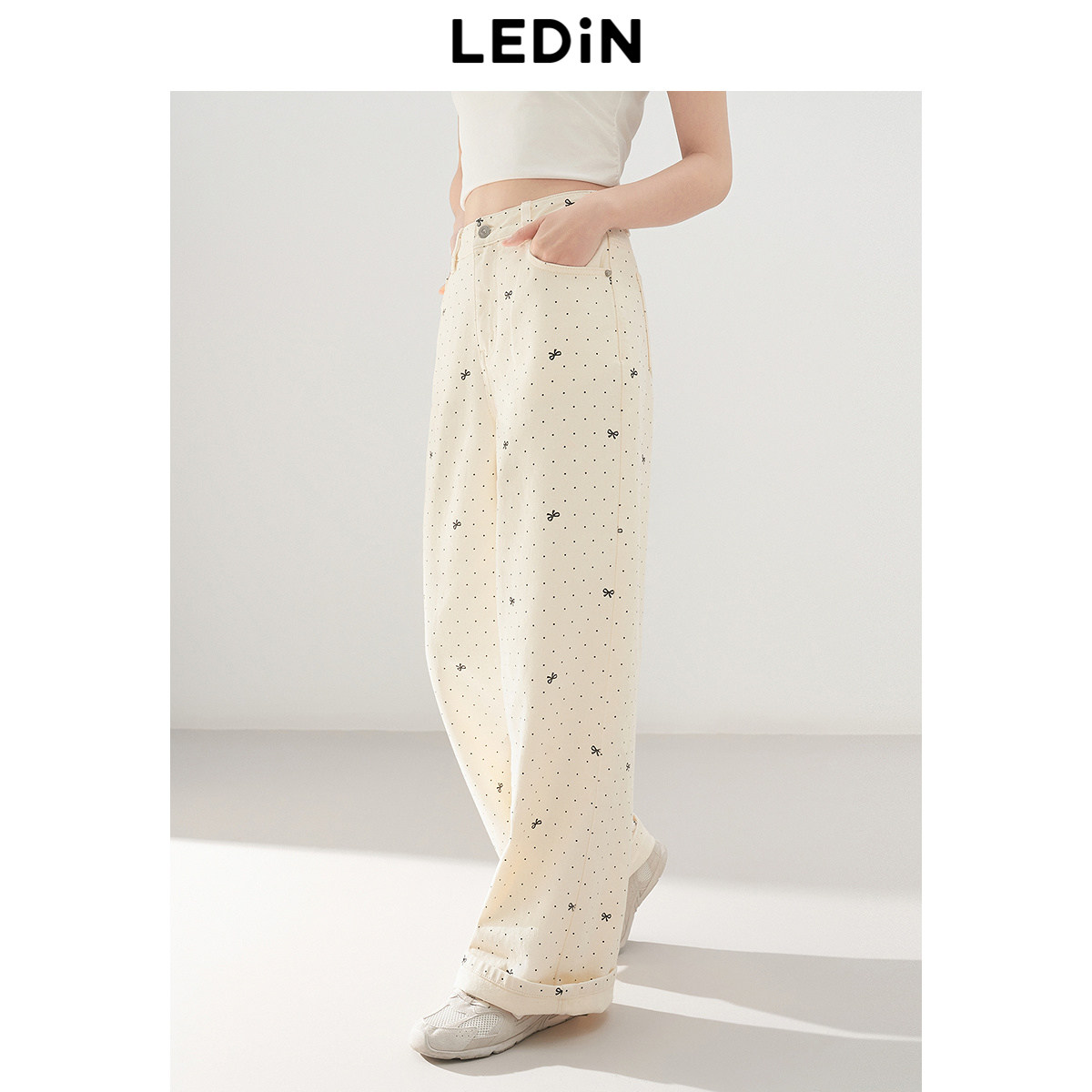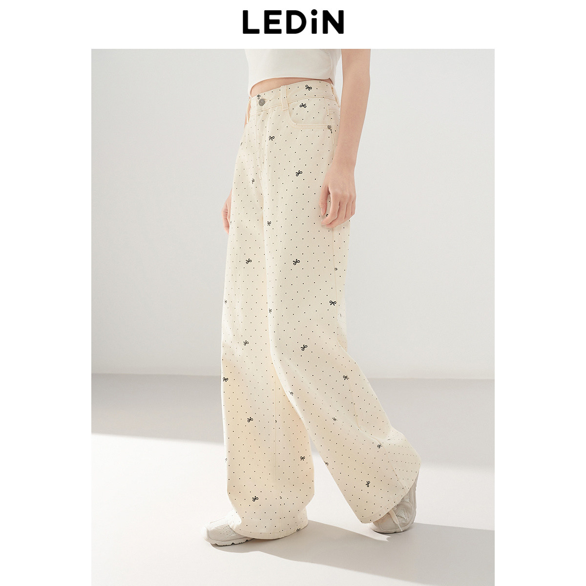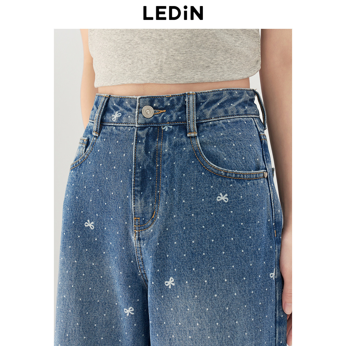 乐町蝴蝶结波点图案牛仔裤2025春季新款直筒长裤高腰窄版阔腿裤子