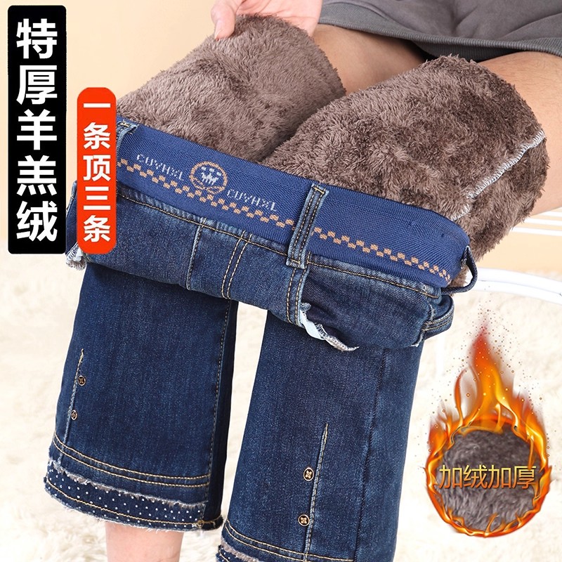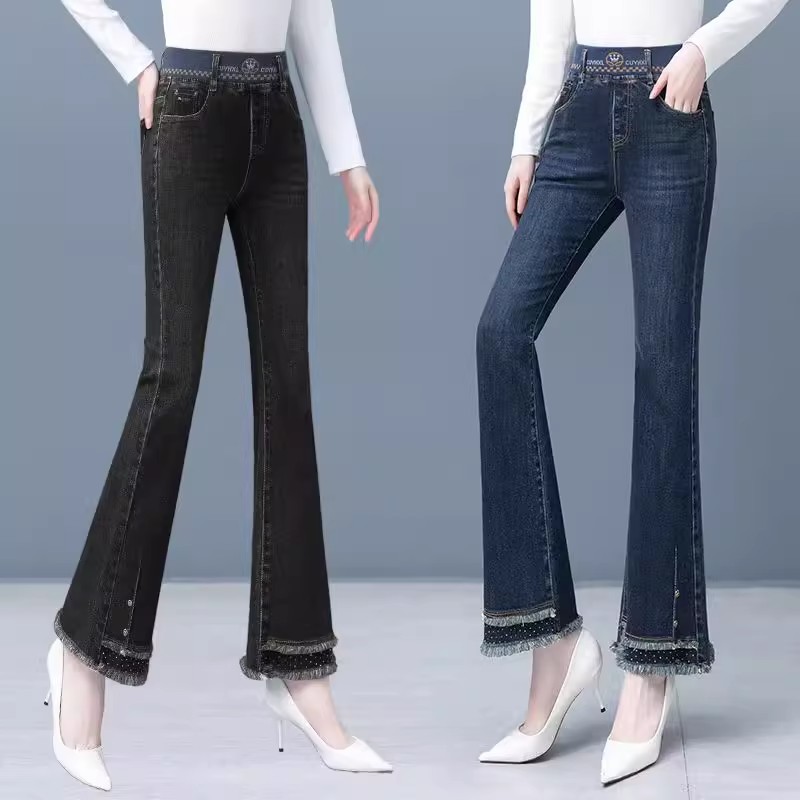 松紧高腰微喇叭牛仔裤女士秋冬新款弹力毛边马蹄加绒加厚喇叭裤子