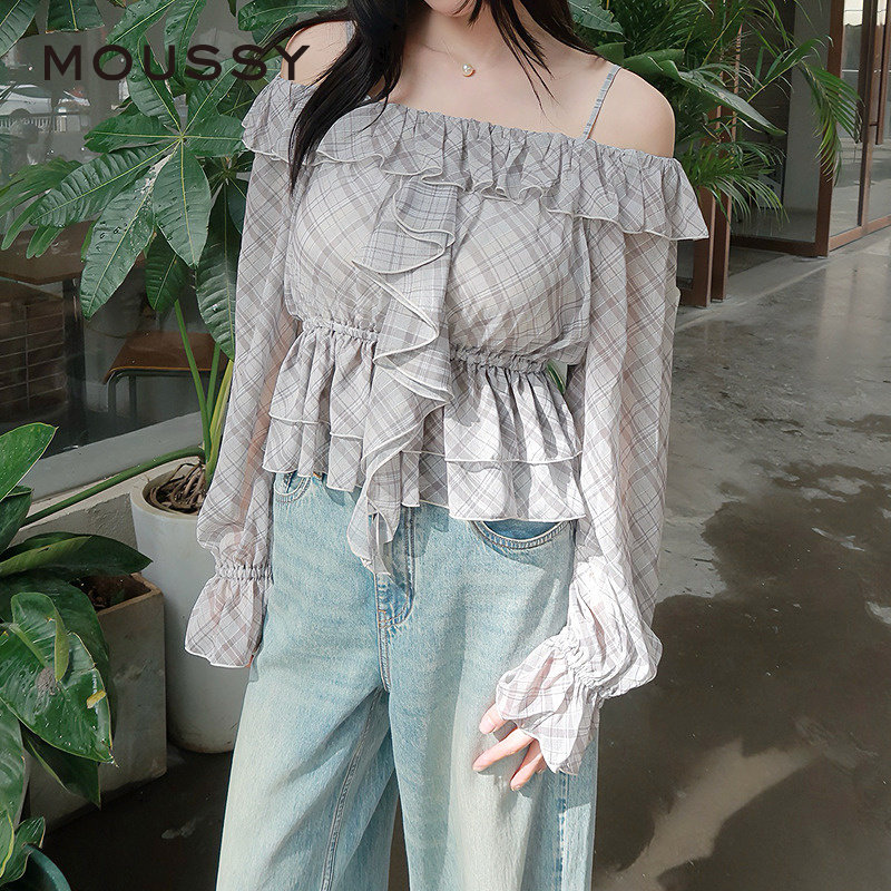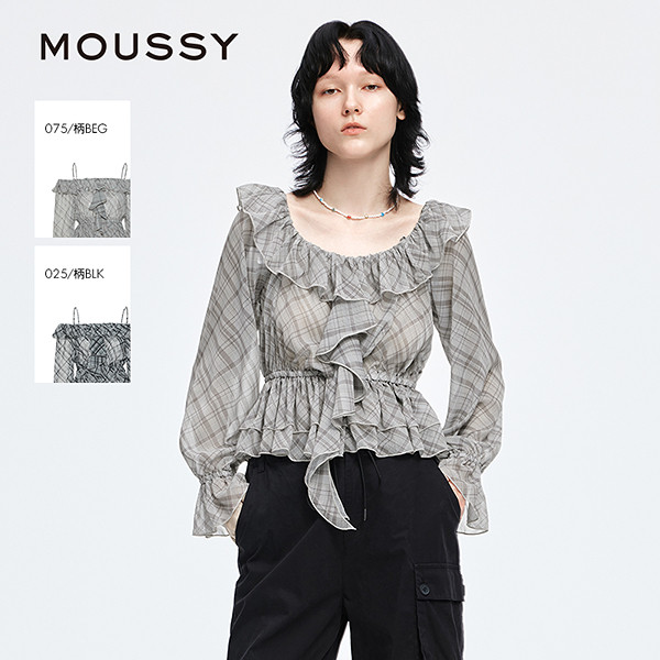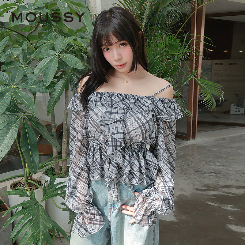 MOUSSY 早春新品甜美荷叶边露肩格子长袖衬衫女028IAA30-1006