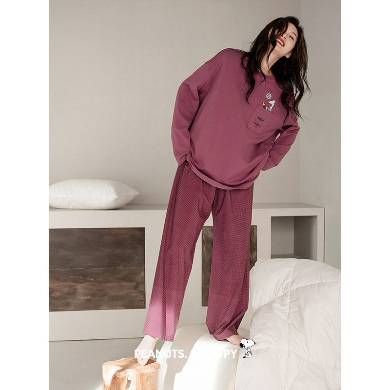 贝妍史努比春秋季柔软棉睡衣女士长袖套装纯色休闲大码外穿家居服