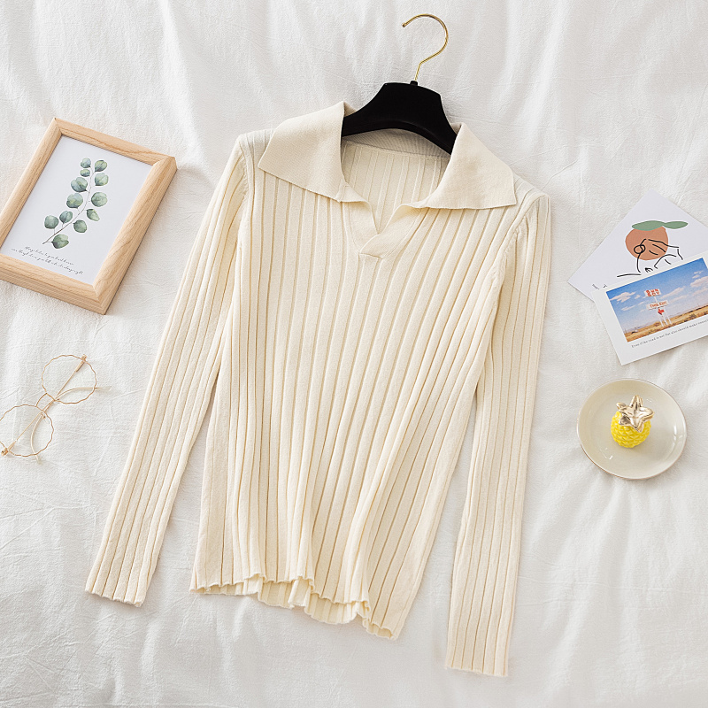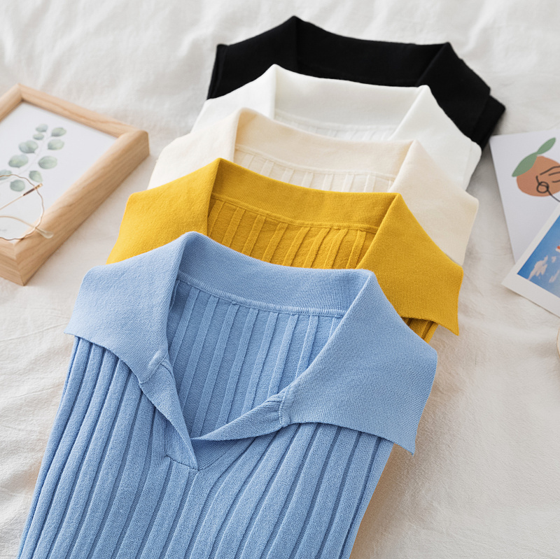 2023秋冬新款韩版坑条翻领套头毛衣女长袖修身短款针织打底衫上衣