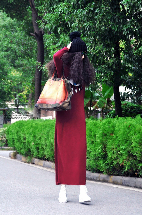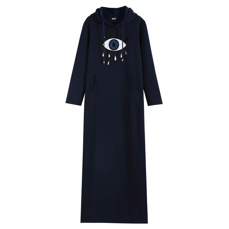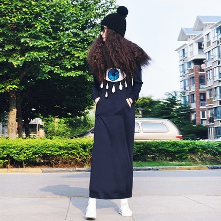 秋冬女连帽加绒亮片大眼睛套头宽松显瘦长袖连衣裙长款卫衣超长裙