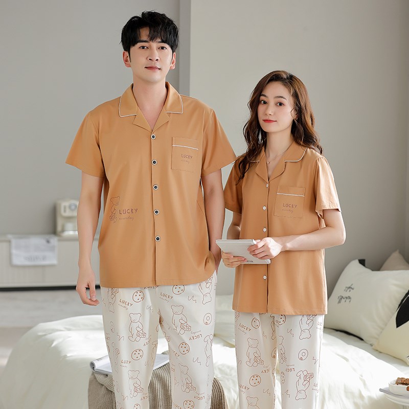 韩版居家情侣睡衣女短袖q长裤夏季纯棉凉感男士家居服套装薄款开
