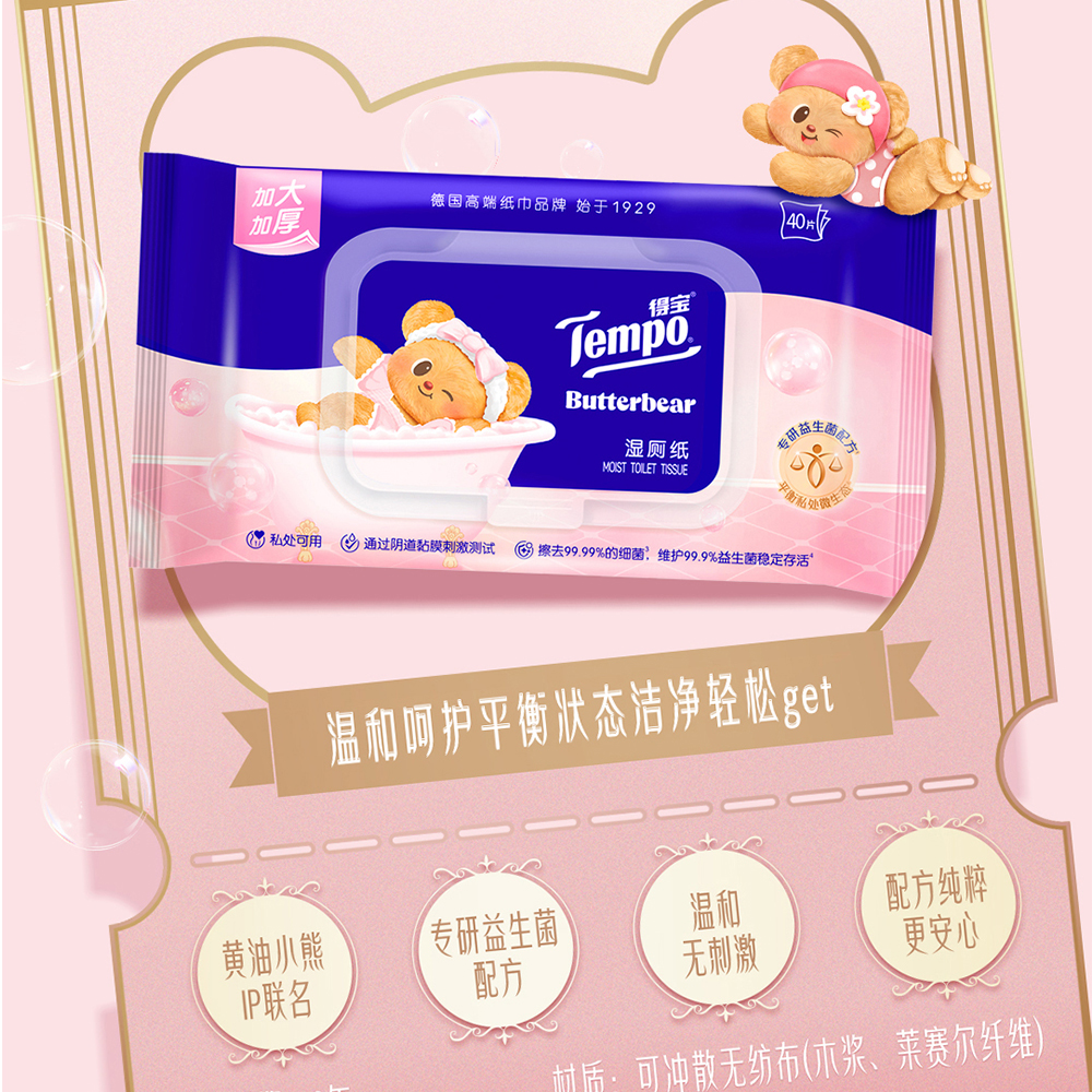 Tempo得宝益生菌系列湿厕纸黄油小熊联名可冲40片加厚洁厕湿巾h