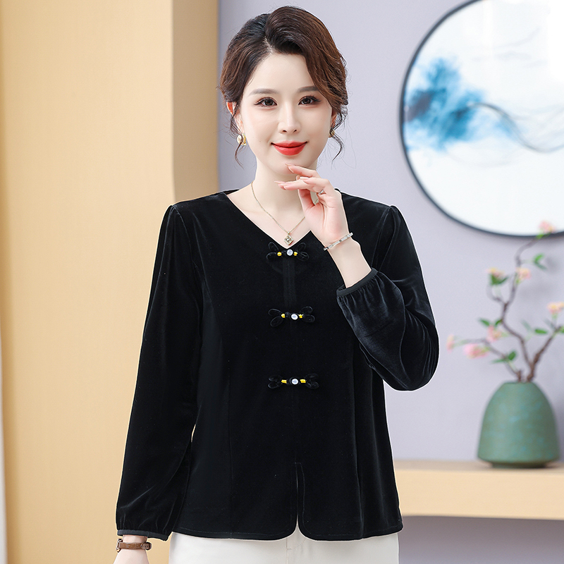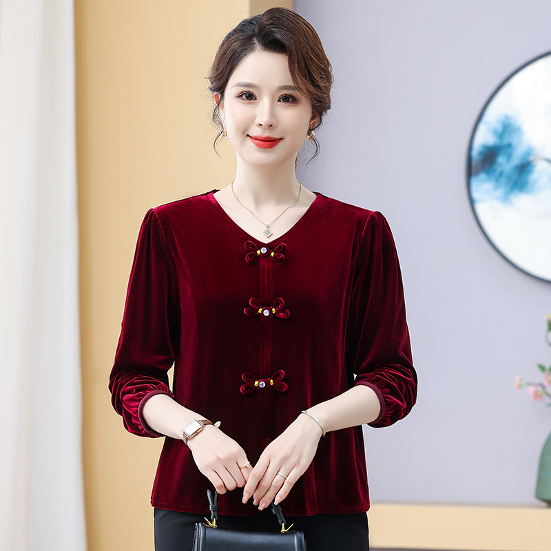 2025年新款妈妈春秋打底衫V领长袖T恤上衣金丝绒中老年女装洋气绣