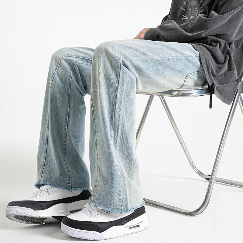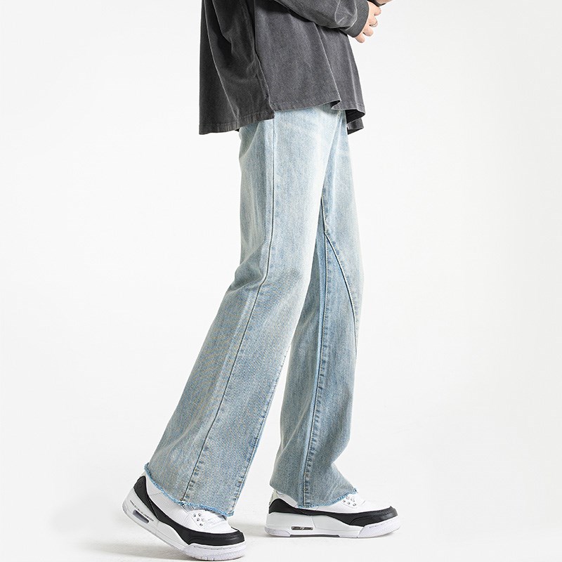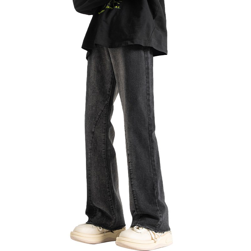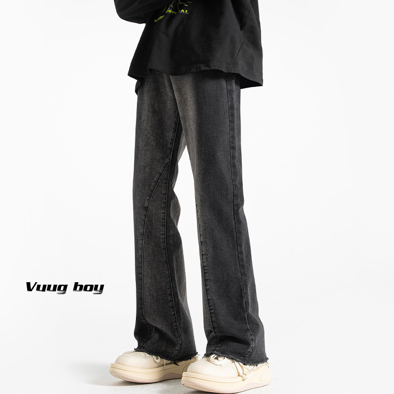 黑色牛仔裤男款秋季美式高街vibe微喇叭裤潮牌宽松直筒毛边长裤子