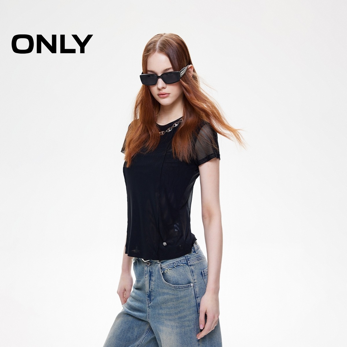 绫致ONLY2025冬新款复古辣妹风显瘦正肩轻薄圆领短袖打底衫T恤女