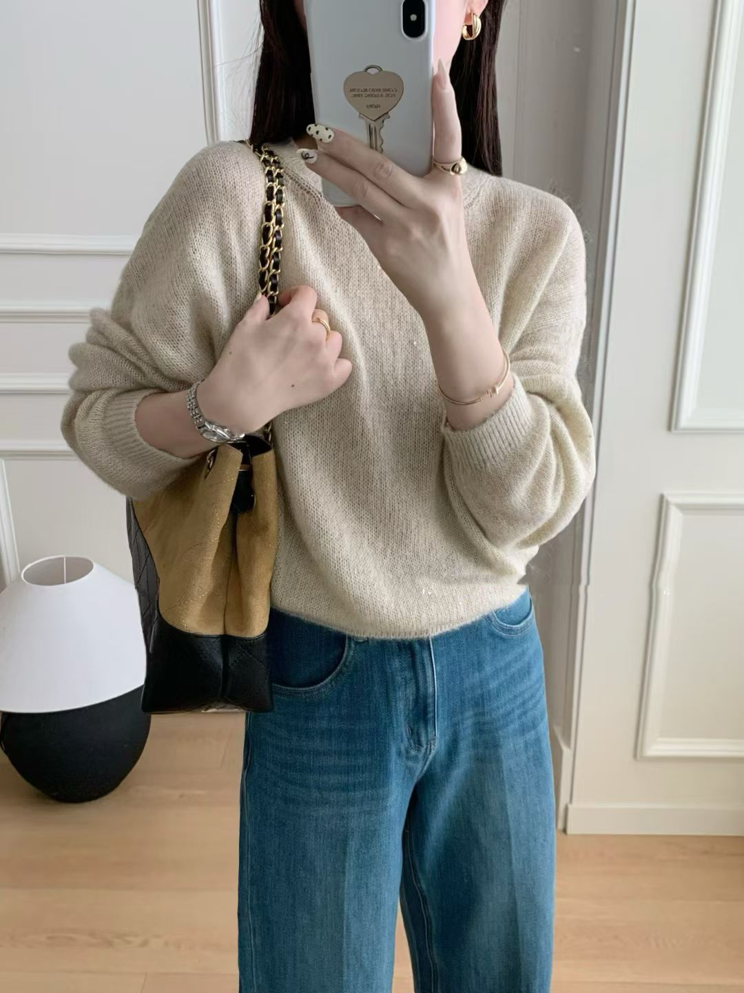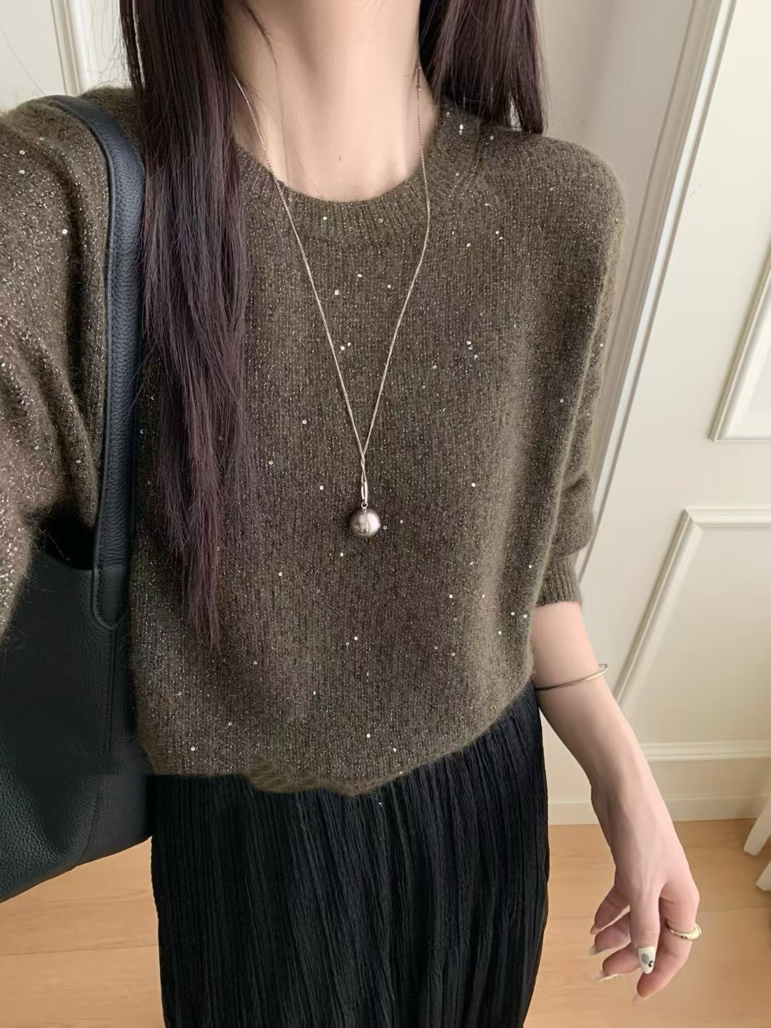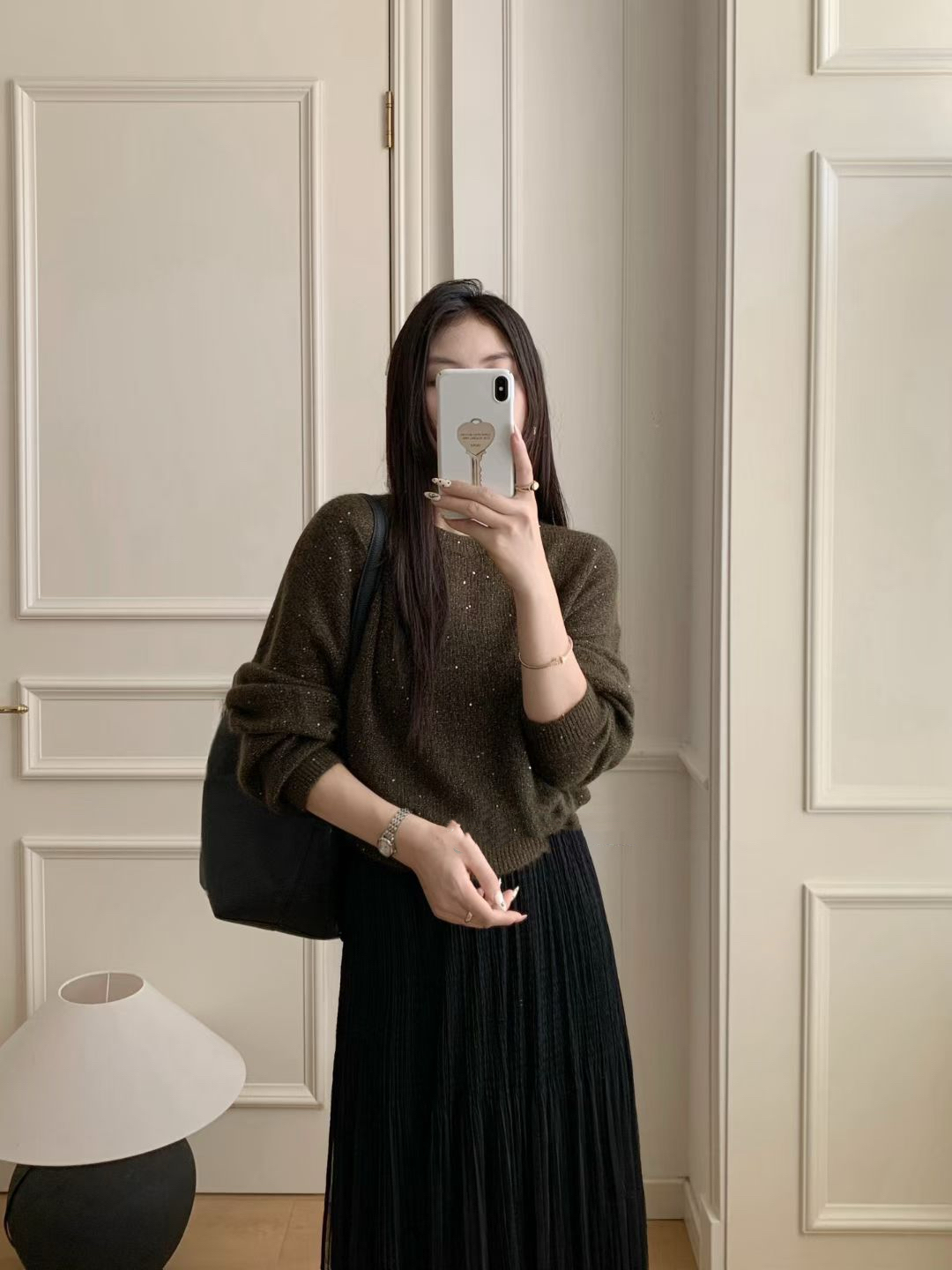 韩国东大门正品女装百搭圆领亮片bling长袖针织衫女宽松毛衣精致