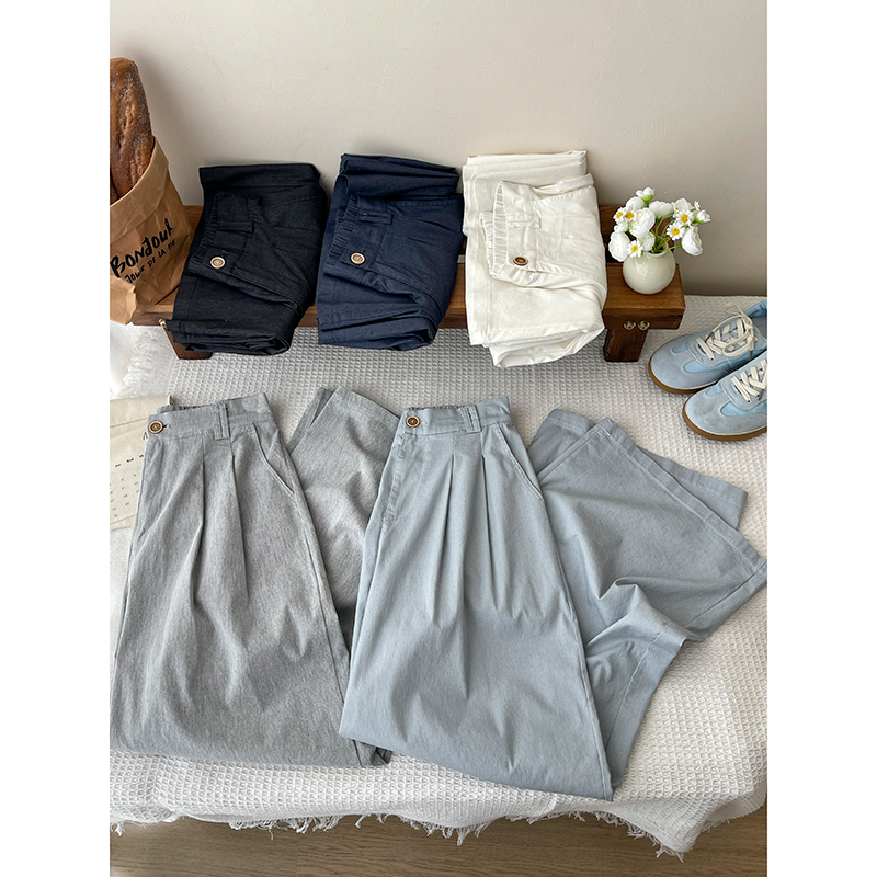 日韩系慵懒天丝洗水棉麻压百褶阔腿裤女夏百搭松弛垂感直筒休闲裤