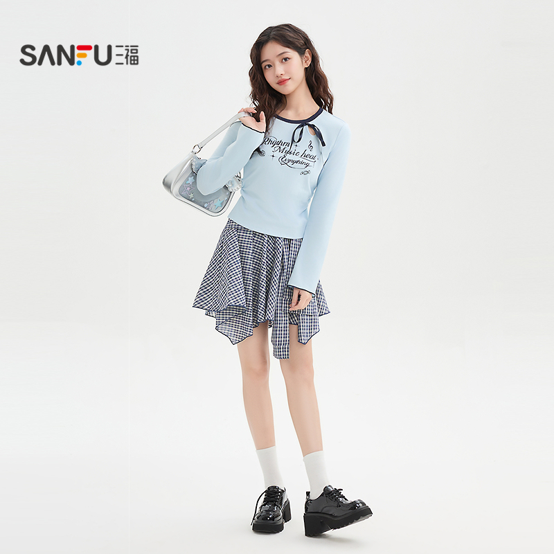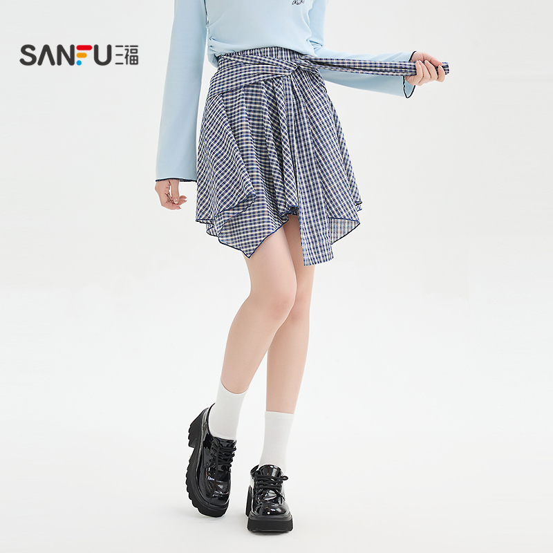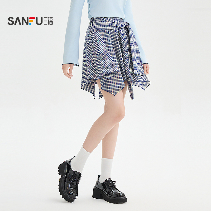 三福短裙2025秋季防走光内衬不规则下摆格子裙子女装509032