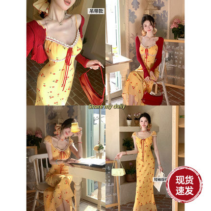 雅乔【樱桃蜜酿】2个版夏季海边度假风蕾丝花边小樱桃碎花连衣裙