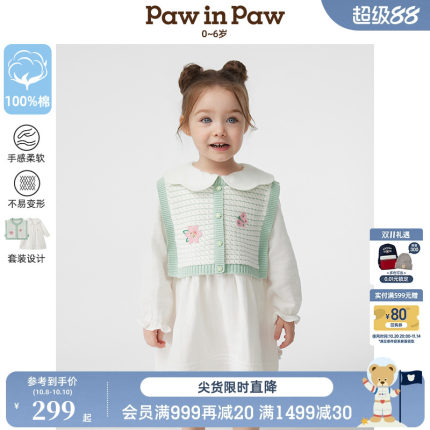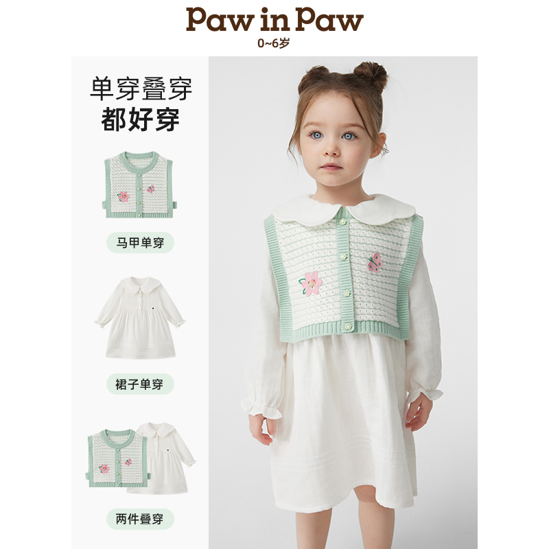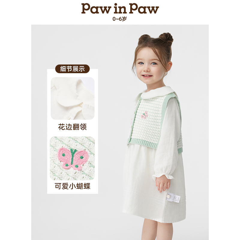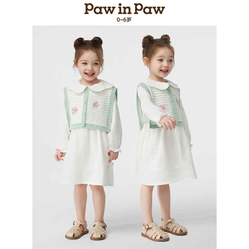 PawinPaw卡通小熊童装25年春夏新款女宝宝花边翻领纯棉连衣裙套装