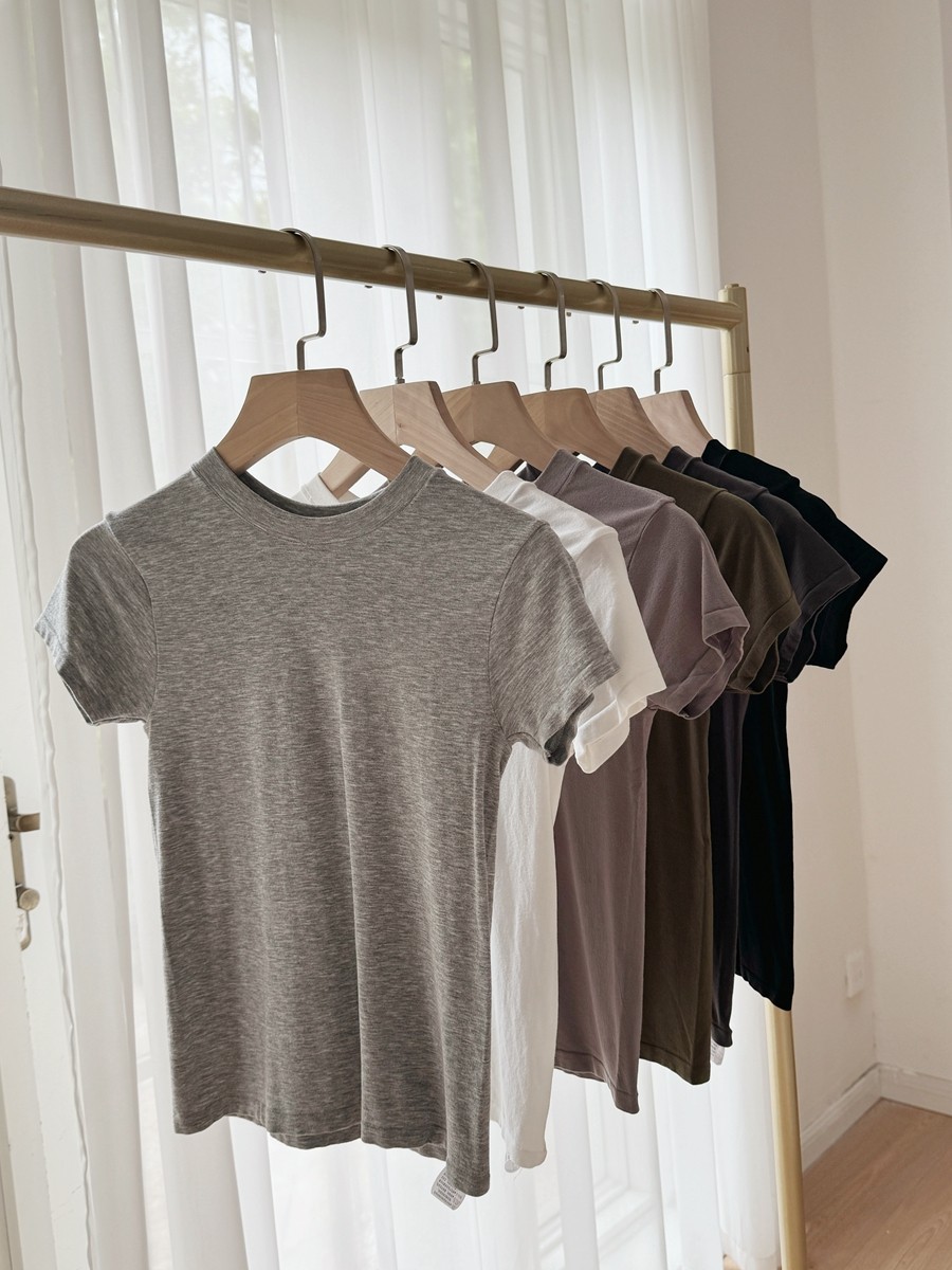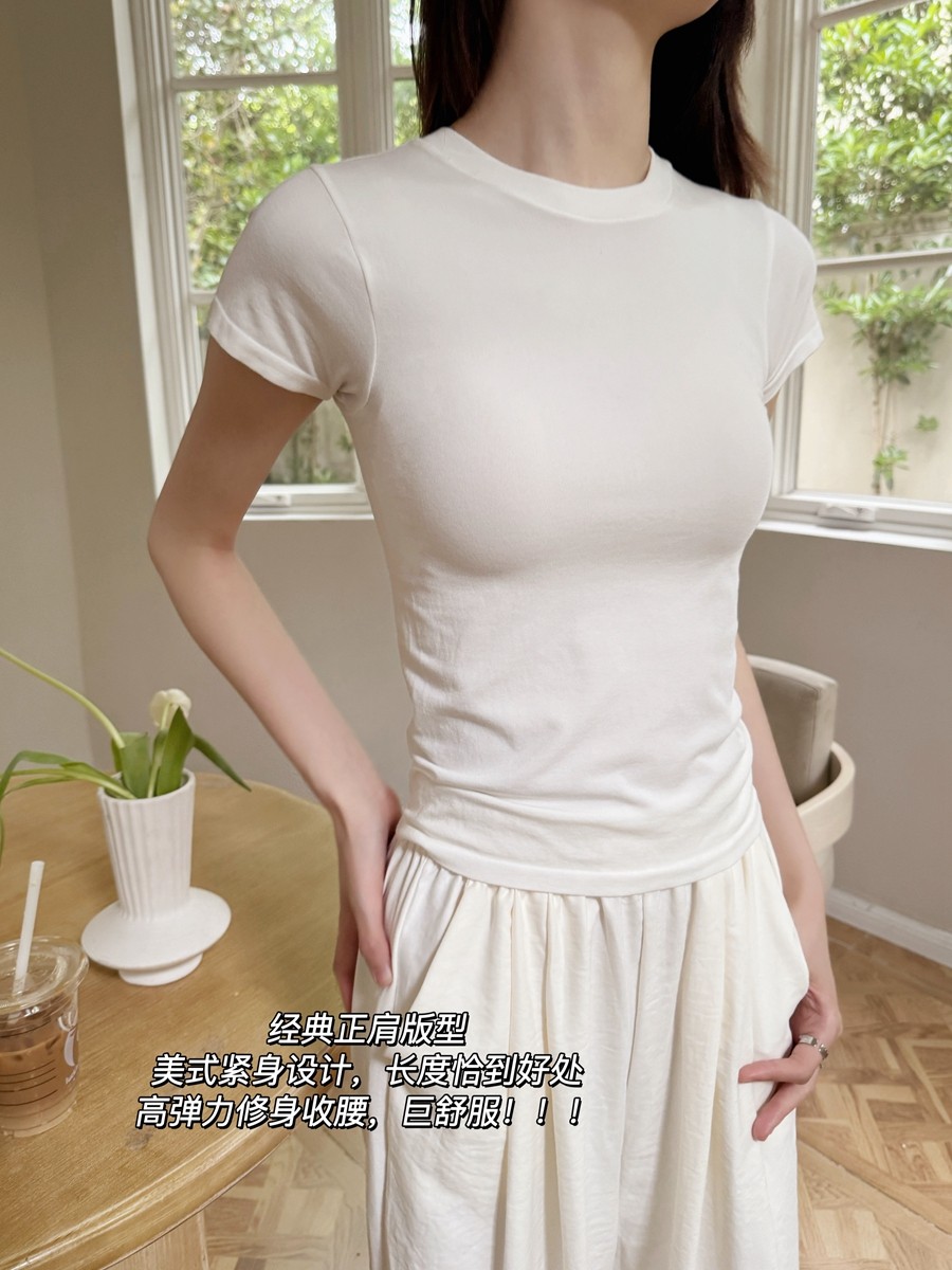 米图美式修身正肩桑蚕丝短袖T恤女显瘦辣妹紧身圆领薄款肯豆上衣
