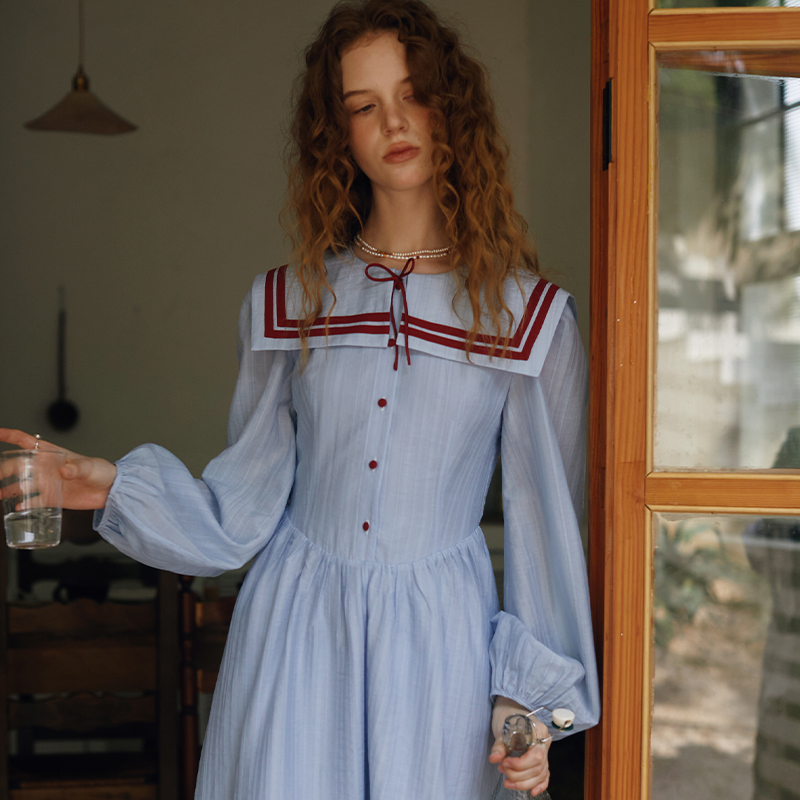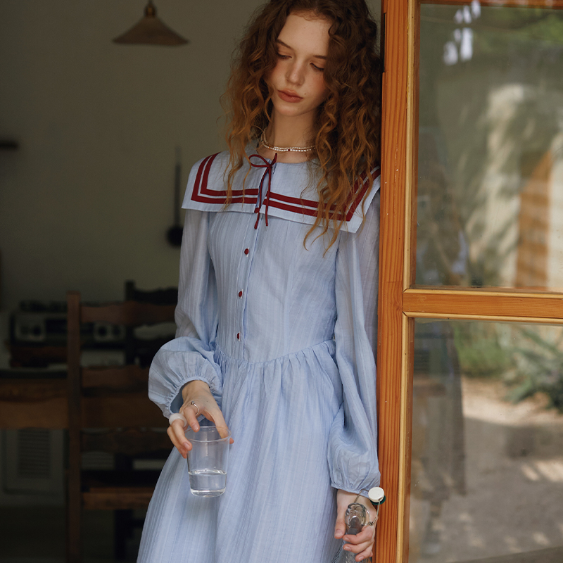 XUNRUO熏若设计师品牌航海系25夏上新浅蓝海军领蝴蝶结长袖连衣裙