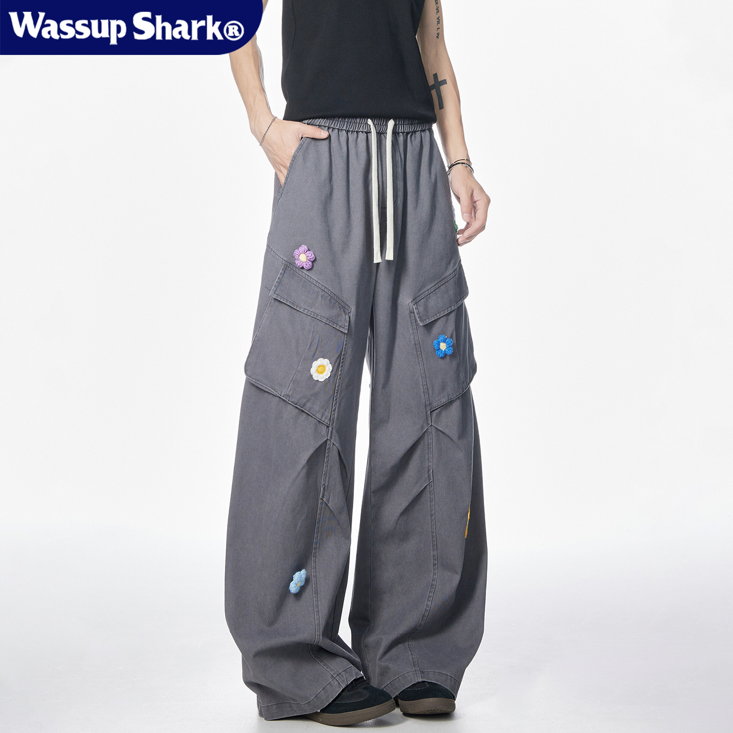 Wassup Shark工装立体花朵刺绣休闲裤男女潮流百搭纯棉宽松阔腿裤