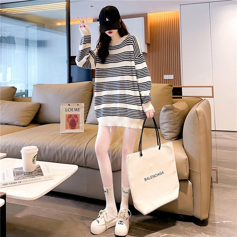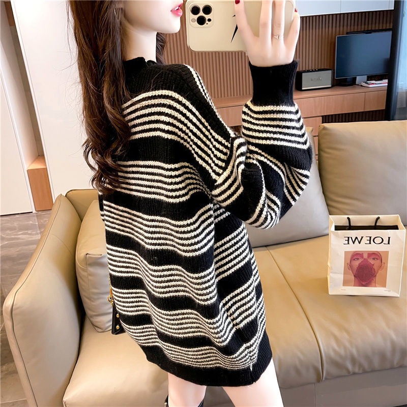 2025秋季宽松休闲风针织套头时尚条纹毛衣女中长款减龄洋气上衣潮