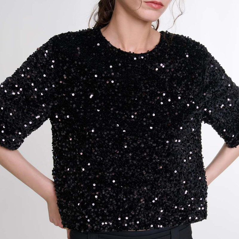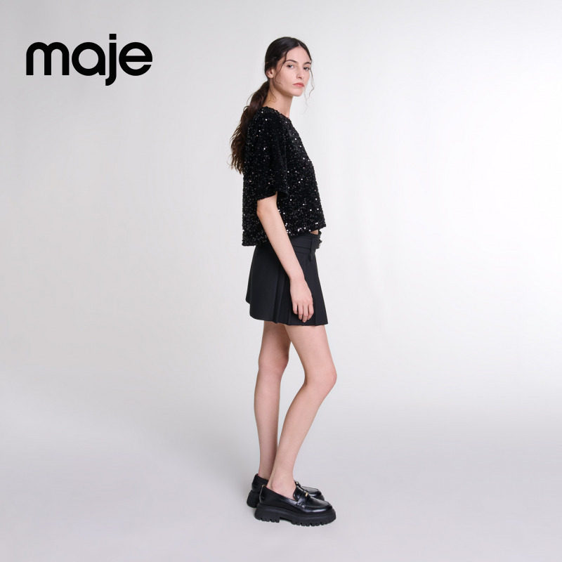 季末7折Maje2025秋冬新款女装法式气质黑色圆领亮片短袖针织上衣