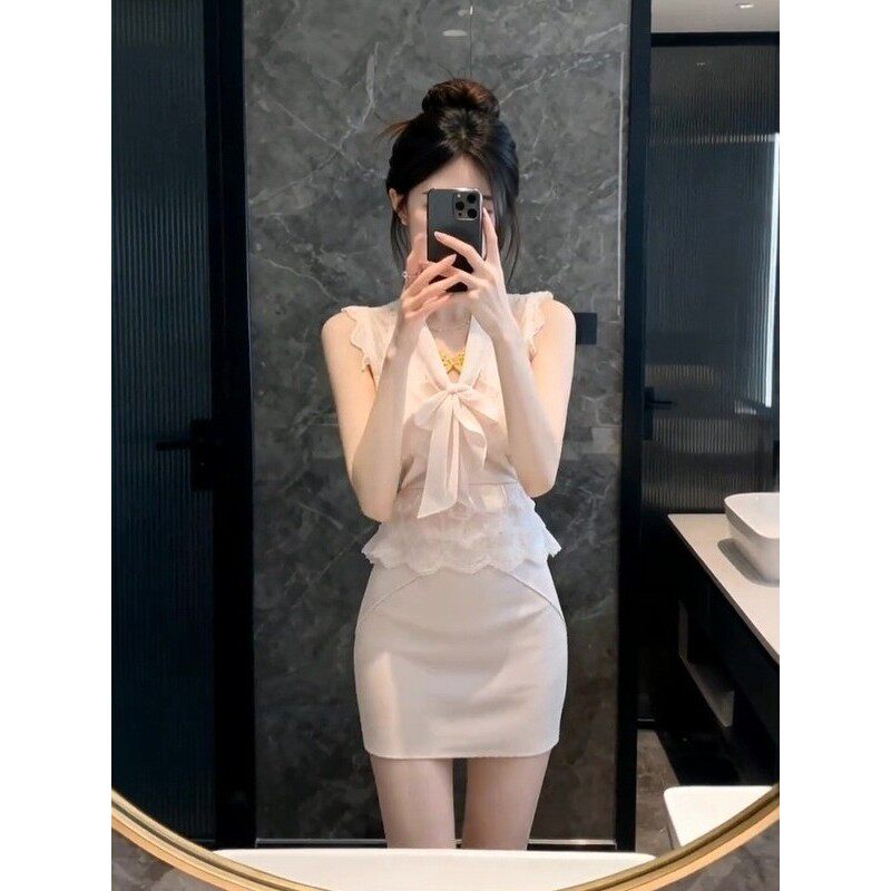 法式纯欲风蕾丝拼接v领无袖背心半身裙两件套女秋冬气质绝美套装
