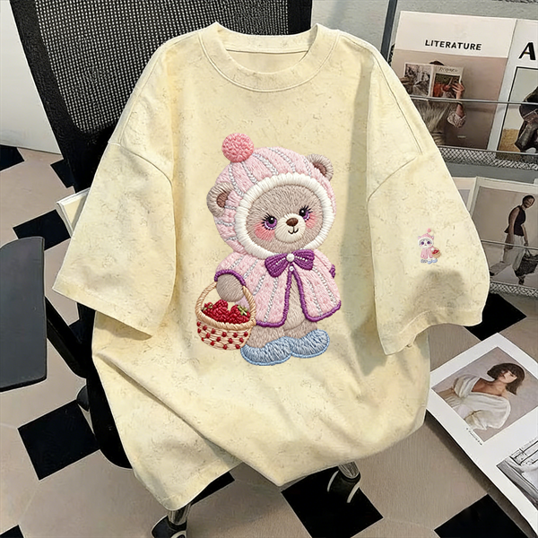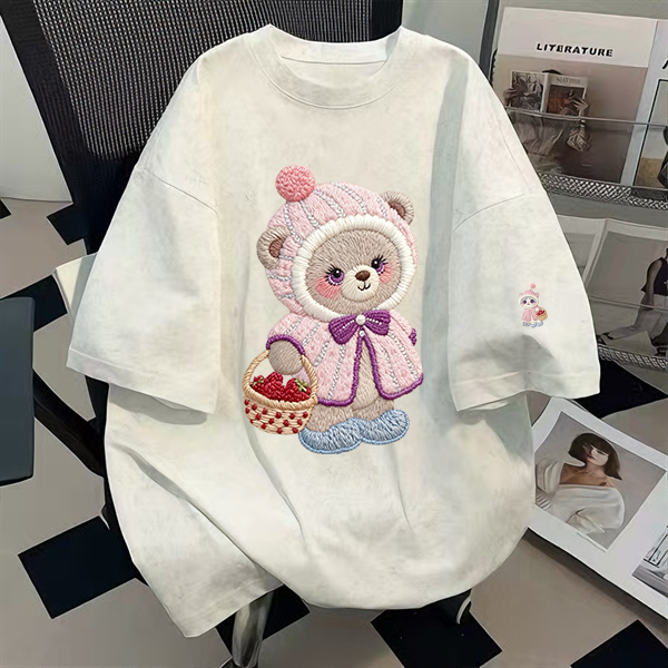 粉色纯棉萌趣小熊扎染短袖t恤男女夏季中长款宽松圆领情侣上衣ins
