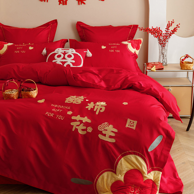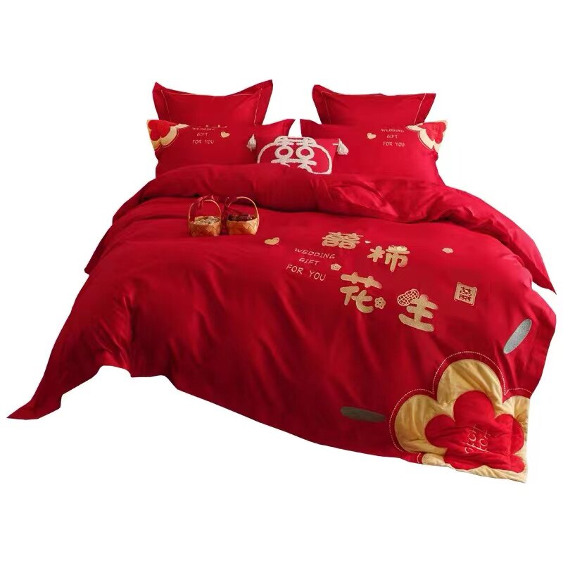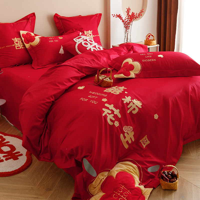 高档婚庆四件套大红色结婚全棉床单纯棉I被套婚房陪嫁床上用品喜