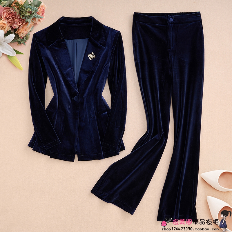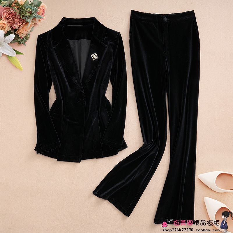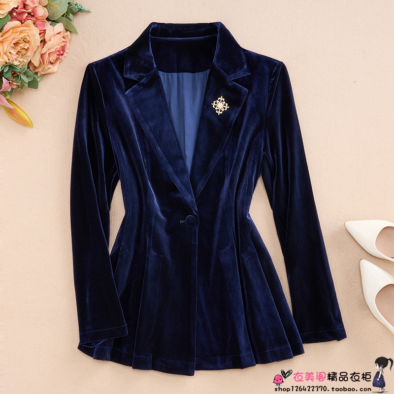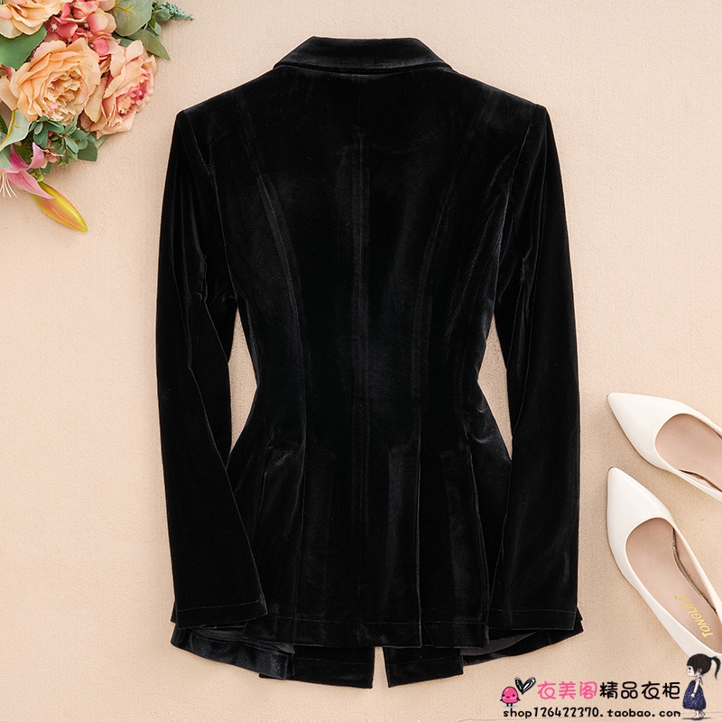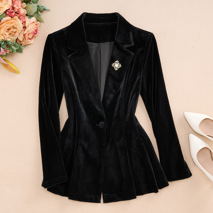 春秋新款黑色丝绒长袖小西装女外套修身遮肚子裙摆金丝绒西服套装