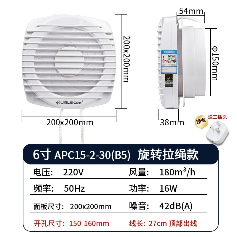 金羚排气扇6/8寸圆孔卫生间玻璃式浴室静音拉绳APC20-2-30(B5)窗