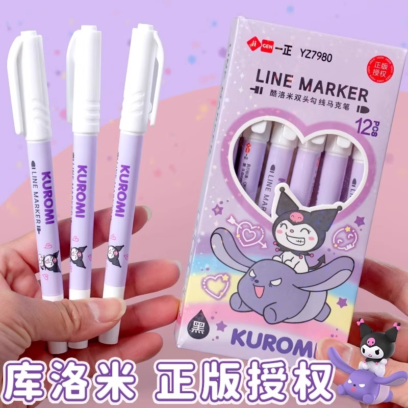 正版库洛米勾线笔小双头记号笔粗细两头黑色三丽鸥卡通马克笔手绘画笔幼儿园儿童勾线笔美术专用小学生描边笔