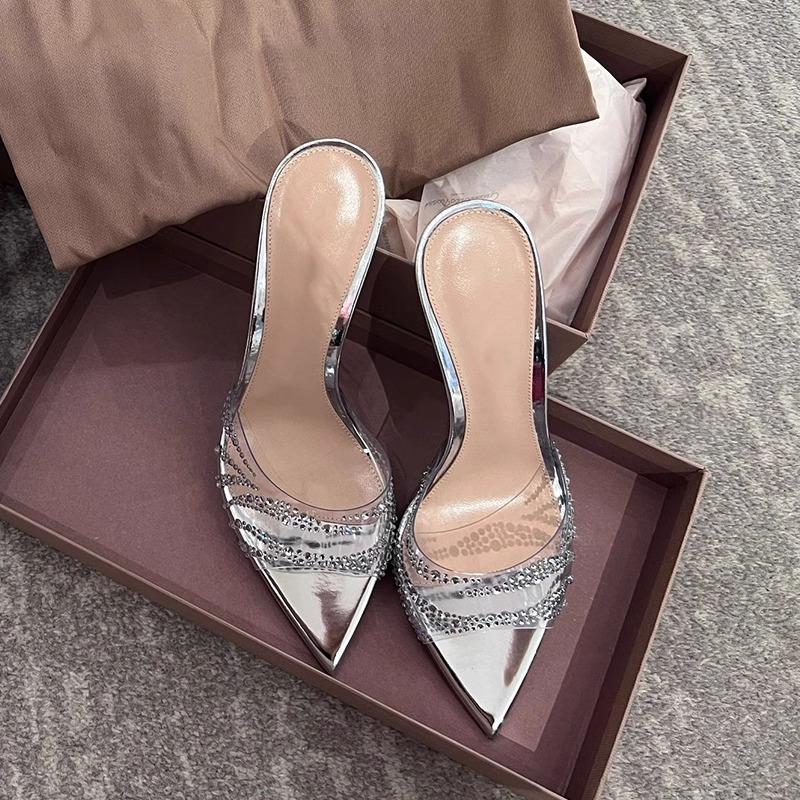 露趾尖头水钻高跟拖鞋女夏外穿细跟性感名媛银色一字带透明拖凉鞋