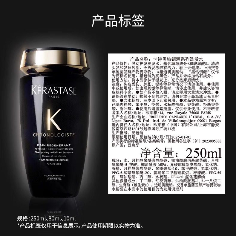 正品卡诗海源黑钻洗发露柔顺护发留香滋润清洁黑钻凝时发水250ml