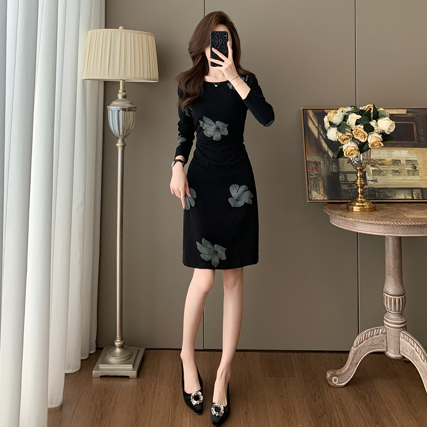法式收腰显瘦长袖印花连衣裙女秋季高级感气质赫本风A字小黑裙子