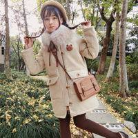 逗酱原创冬季复古熊日系学院全棉浅卡其娃娃领宽松棉服长外套