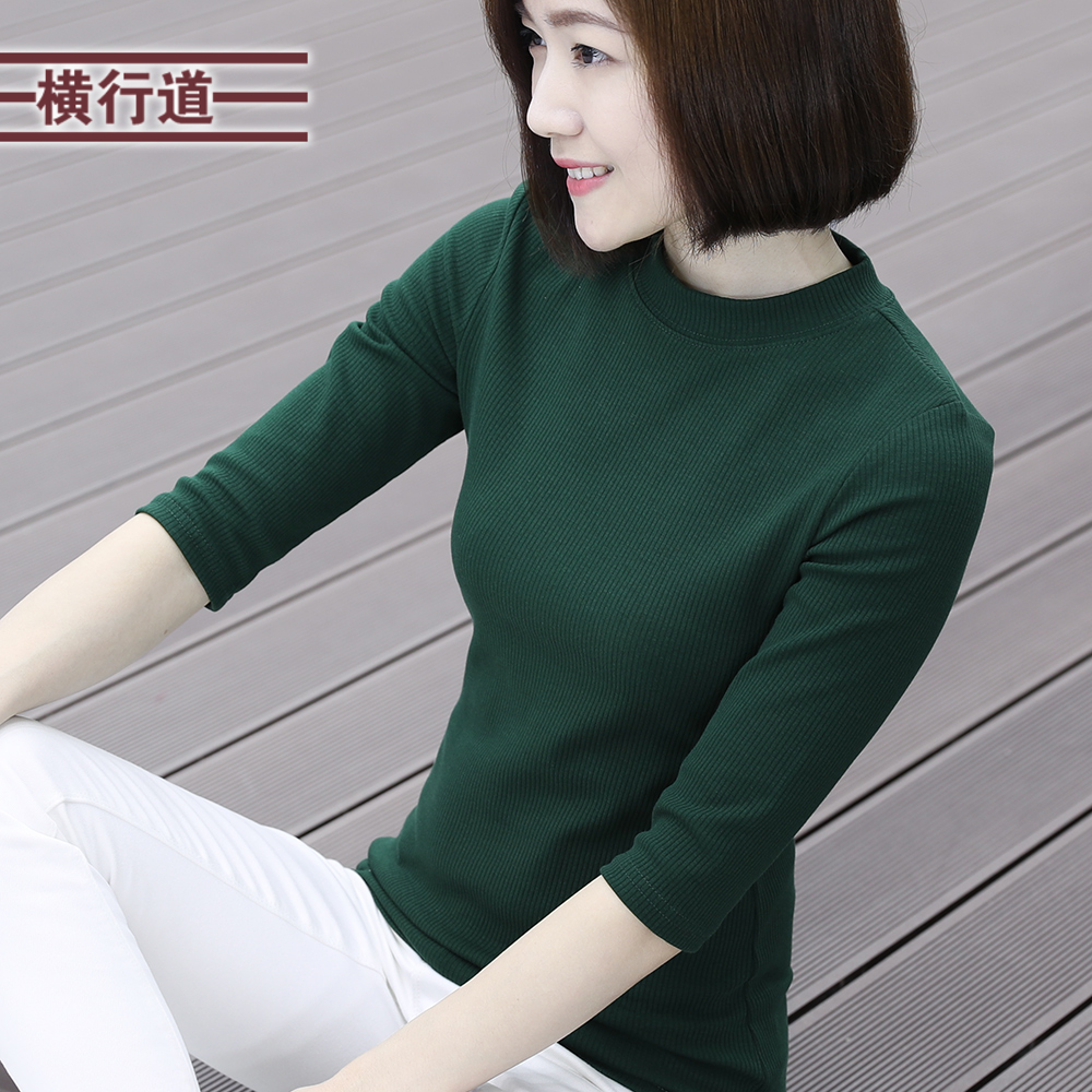 中袖女士2025纯棉女装半高领上衣T恤打底衫简约T恤纯色秋装七分袖