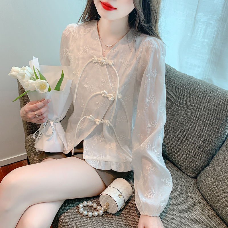 新中式雪纺衬衫女秋季洋气泡泡袖小衫国风盘扣刺绣早秋长袖上衣