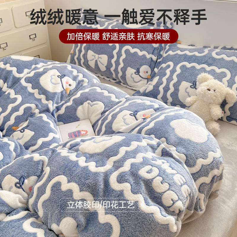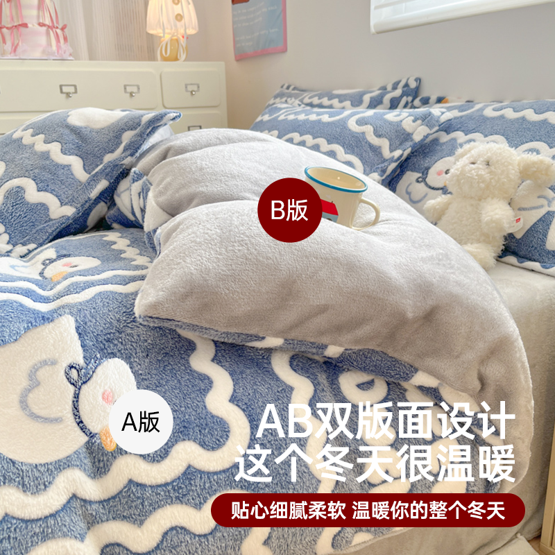 无印良品卡通牛奶绒床上四件套儿童女生被套床单冬季床品三件套