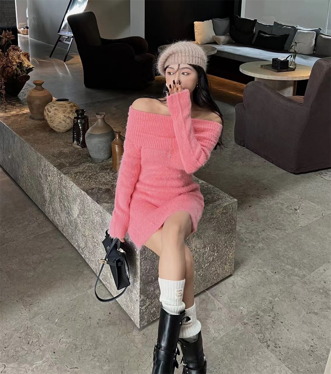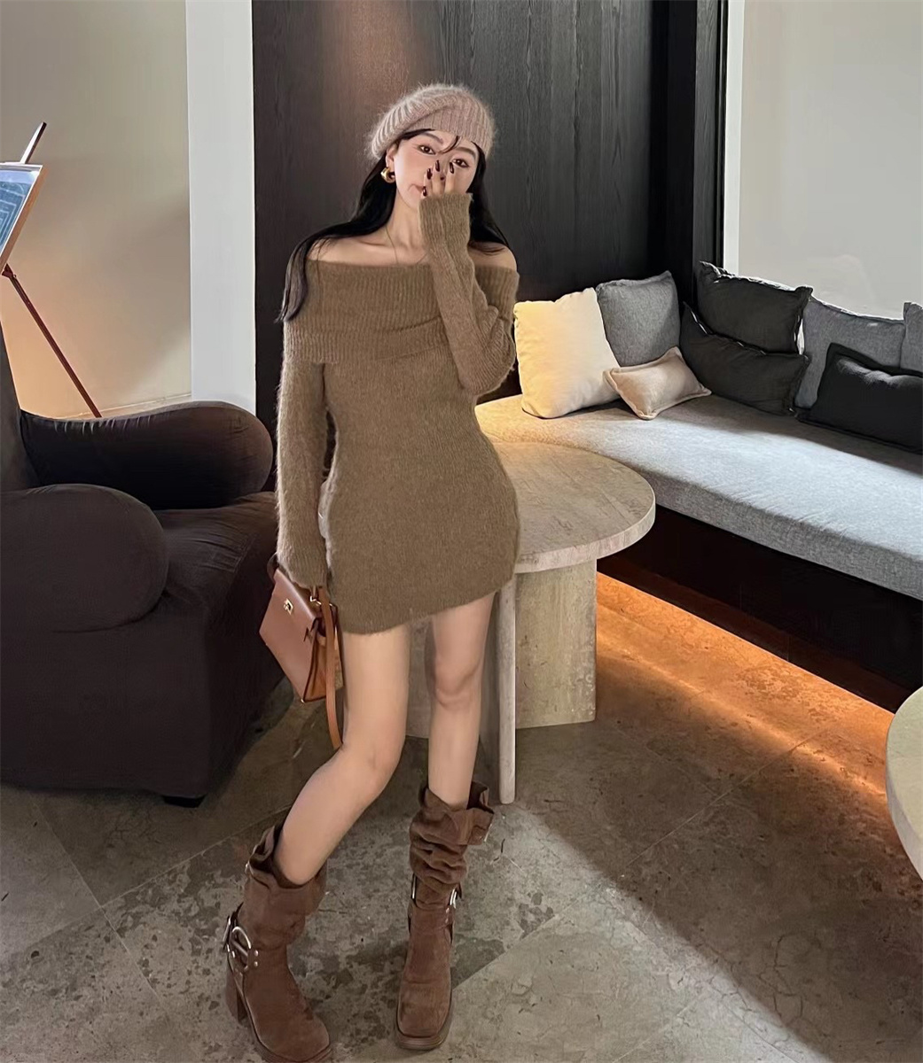 特价气质性感一字肩露肩修身针织连衣裙秋冬加厚羊绒打底毛衣裙子