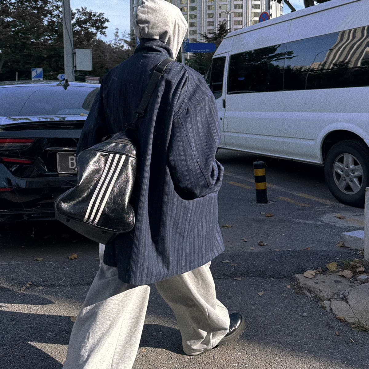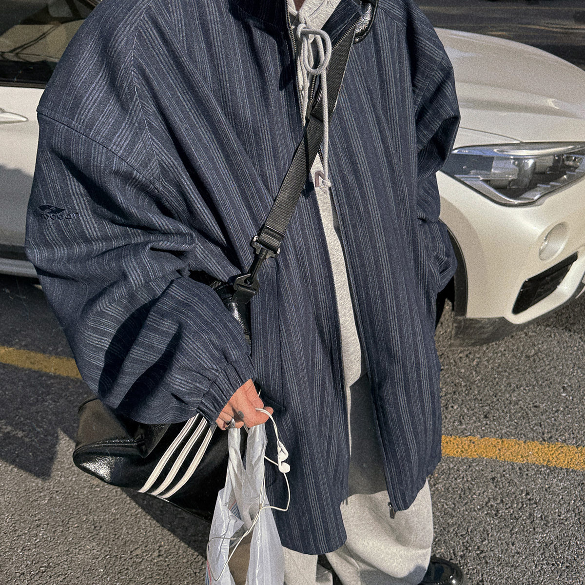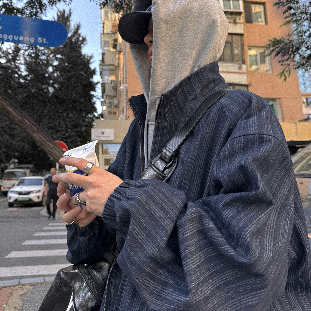 Aurocean 条纹牛仔宽肩廓形长款风衣 低饱和灰蓝色大版防风外套