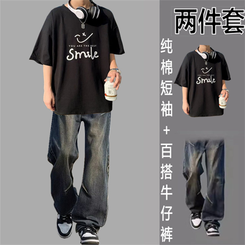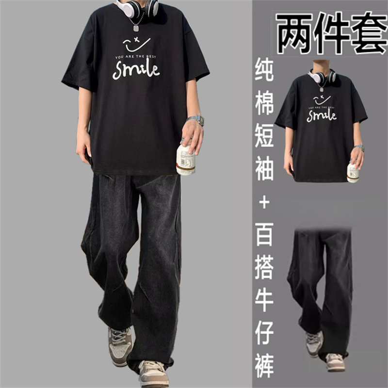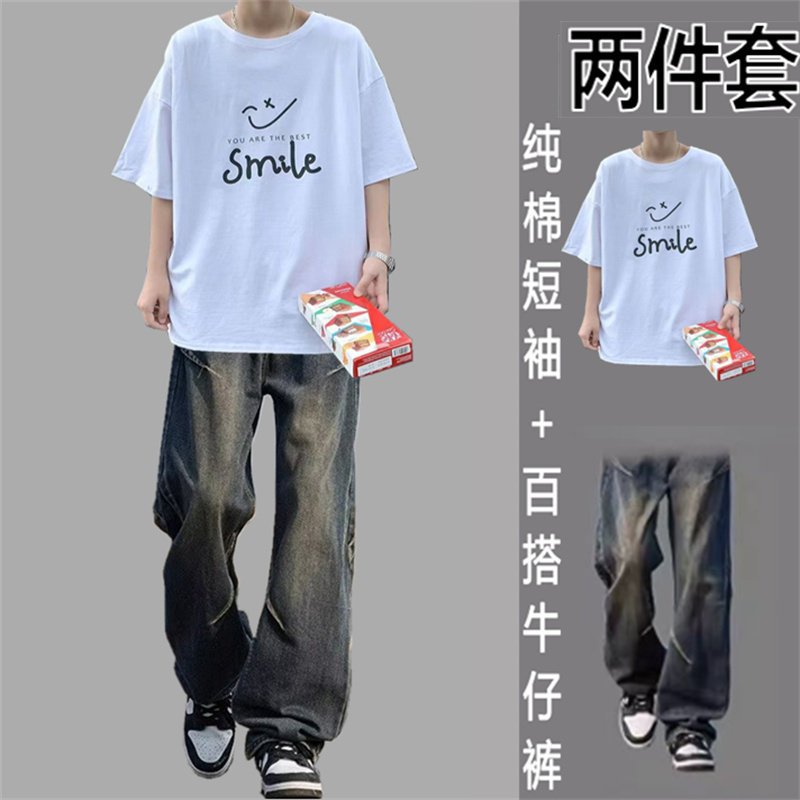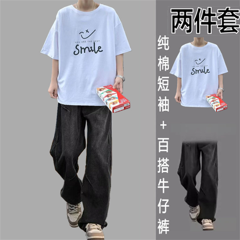 青少年夏季短袖纯棉T恤跑步休闲运动套装牛仔裤子男生韩版宽松ins