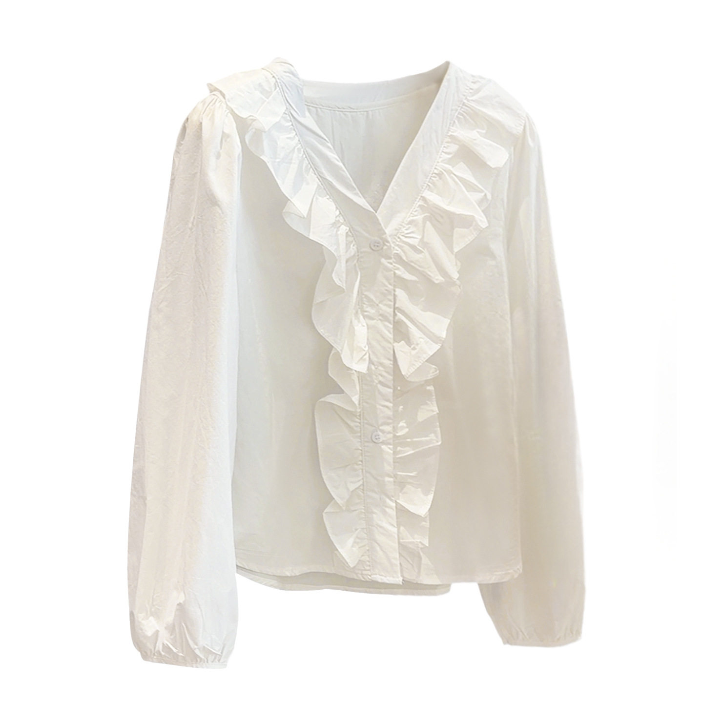 设计感荷叶边V领衬衫女春2026新款时尚减龄宽松显瘦长袖衬衣上衣