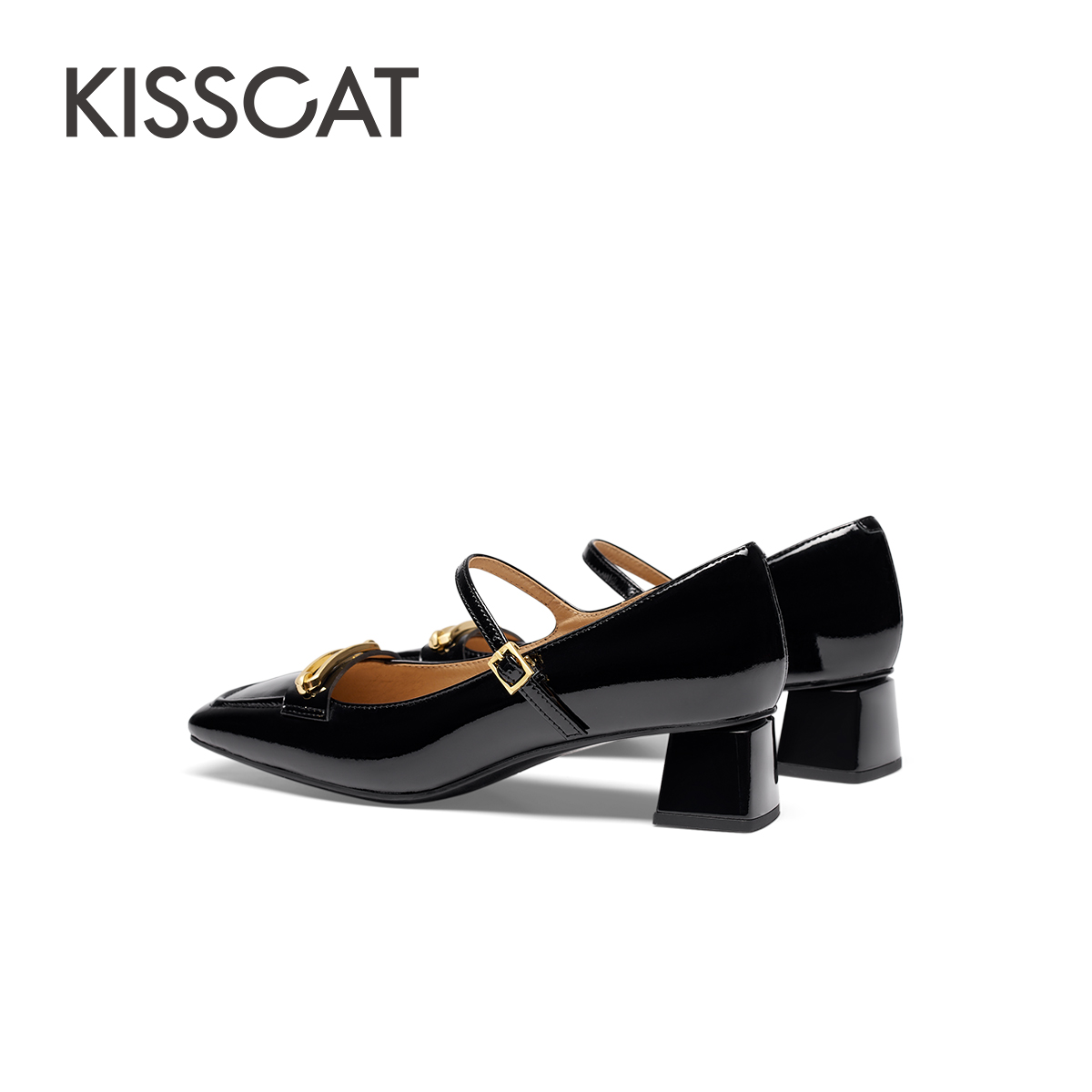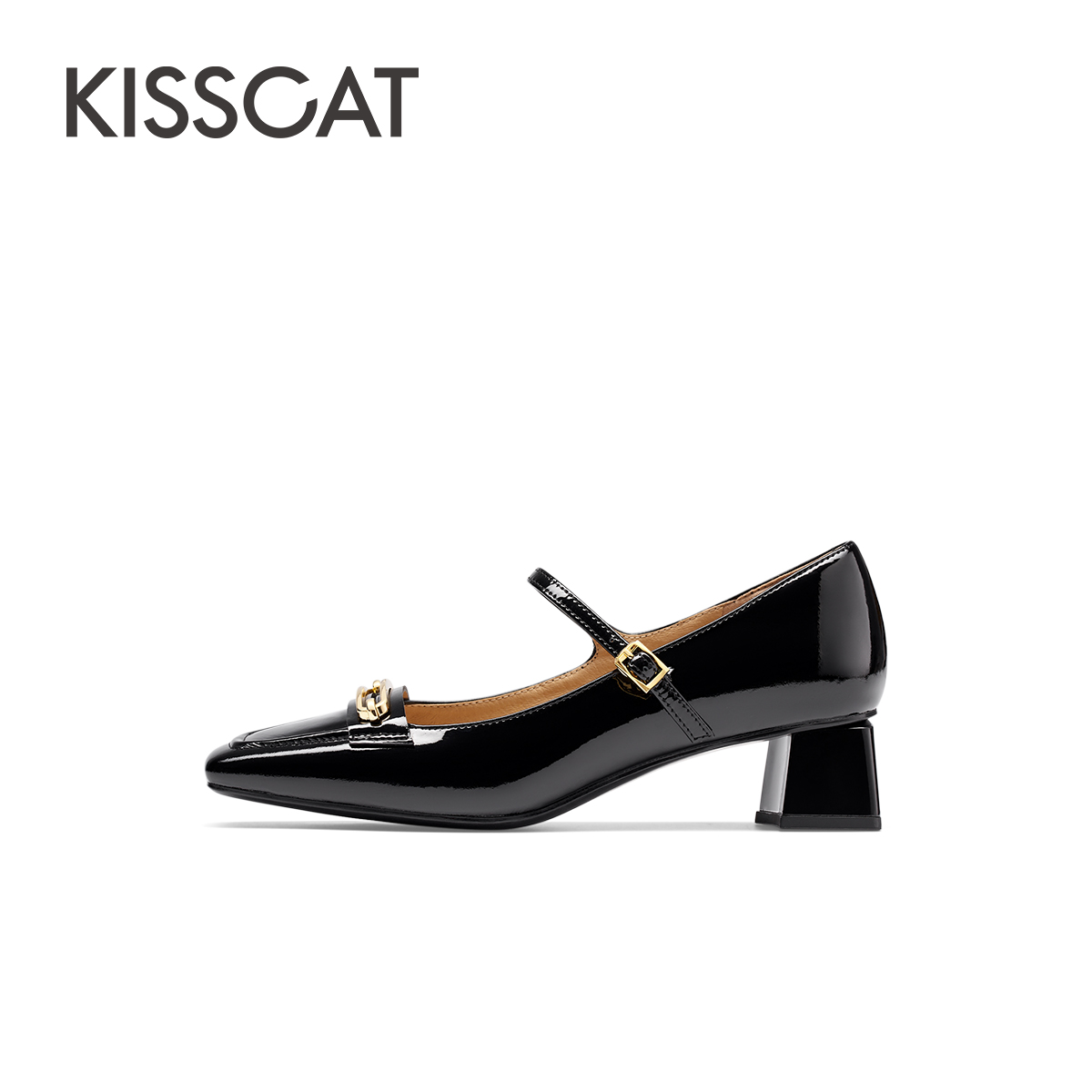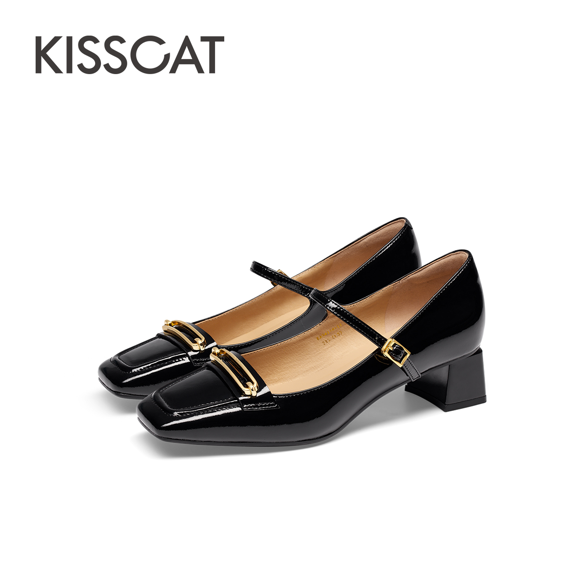 KISSCAT接吻猫气质方头真皮单鞋粗跟复古玛丽珍鞋黑色高跟鞋女