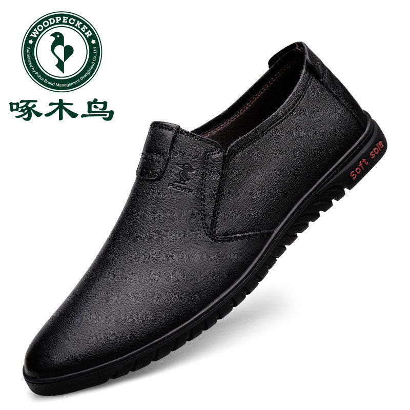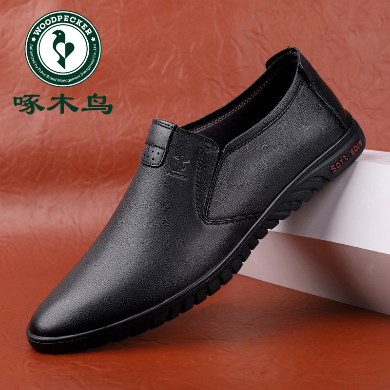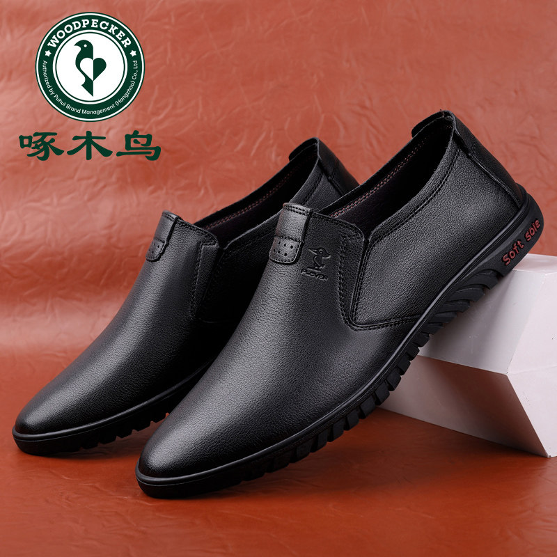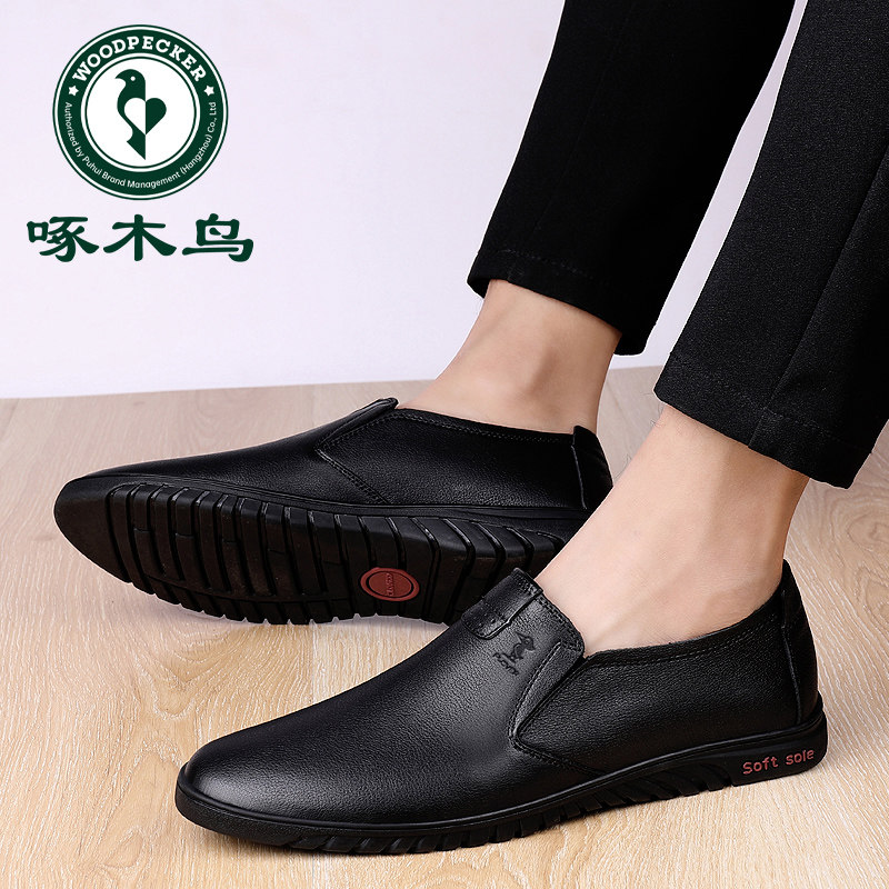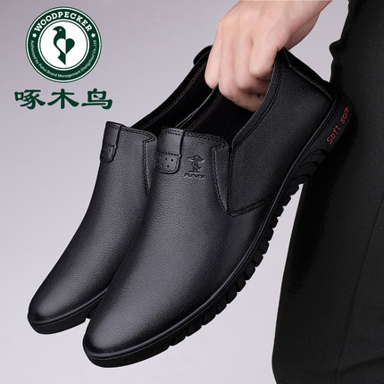 啄木鸟男鞋春季新款男士皮鞋真皮软皮一脚蹬中年爸爸鞋软底休闲鞋