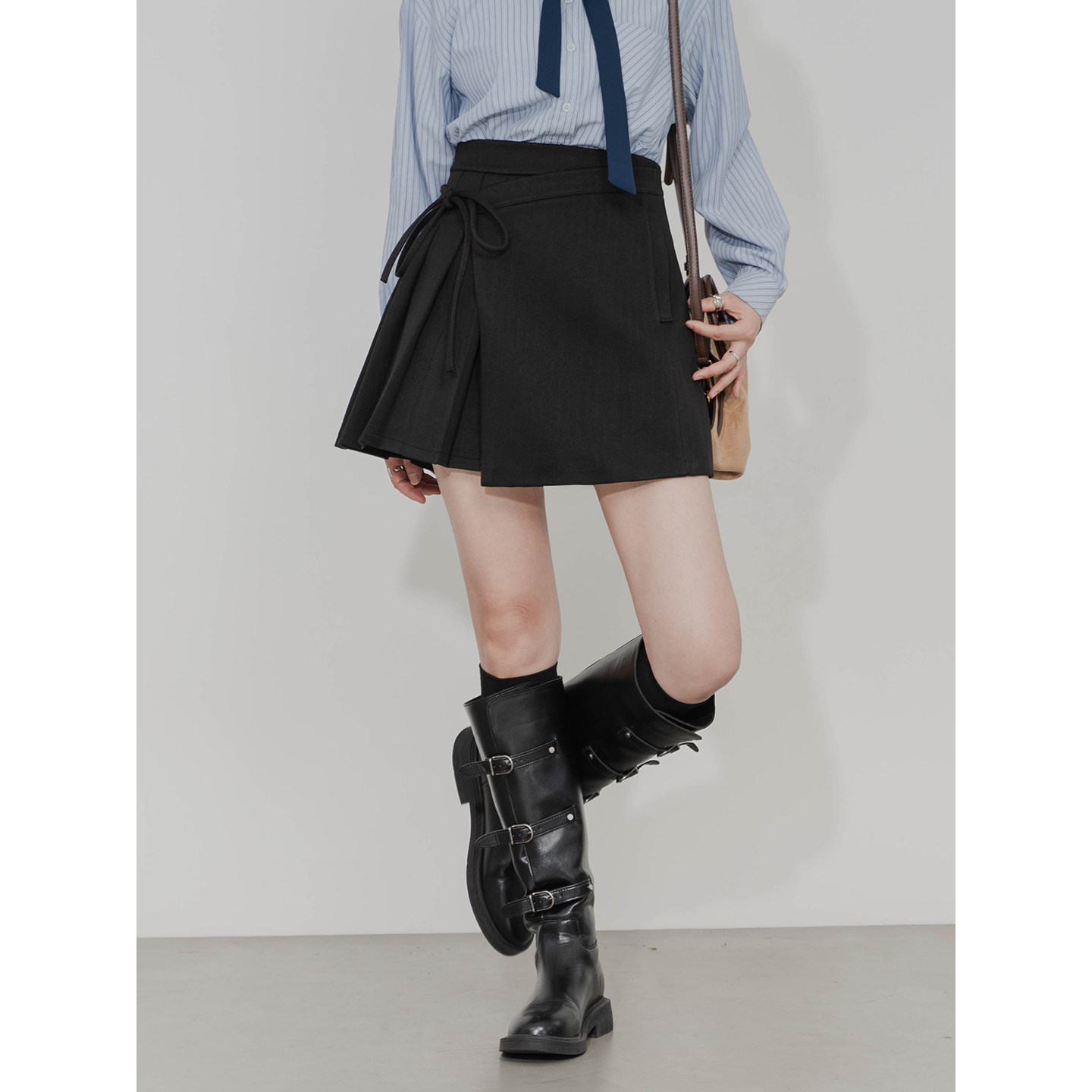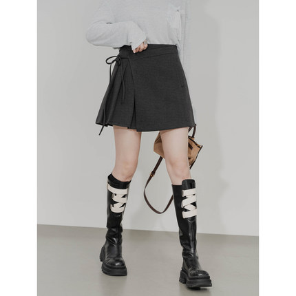 不对称毛呢半身裙女高腰A字设计感内衬修身显瘦绑带百褶呢子短裙