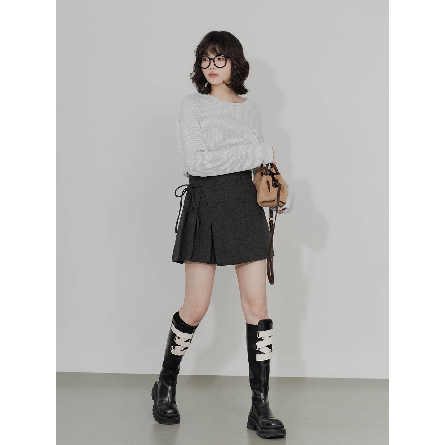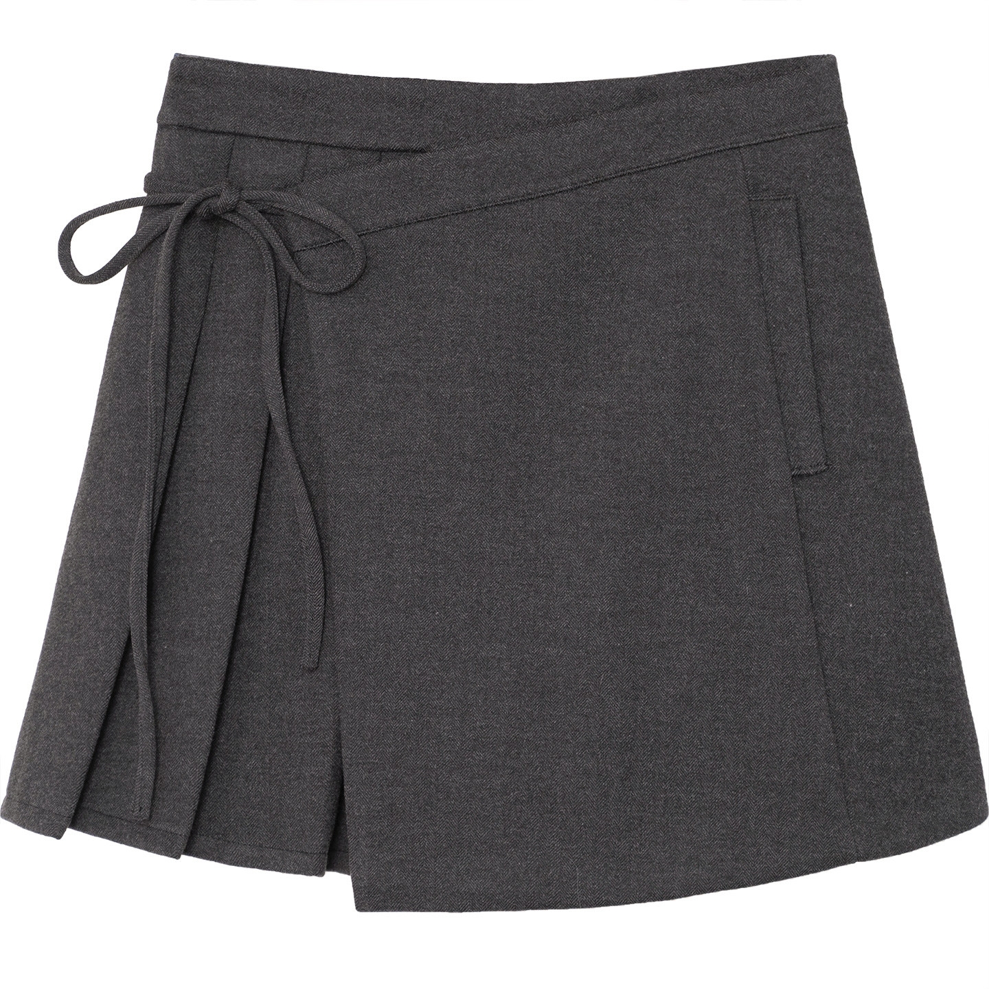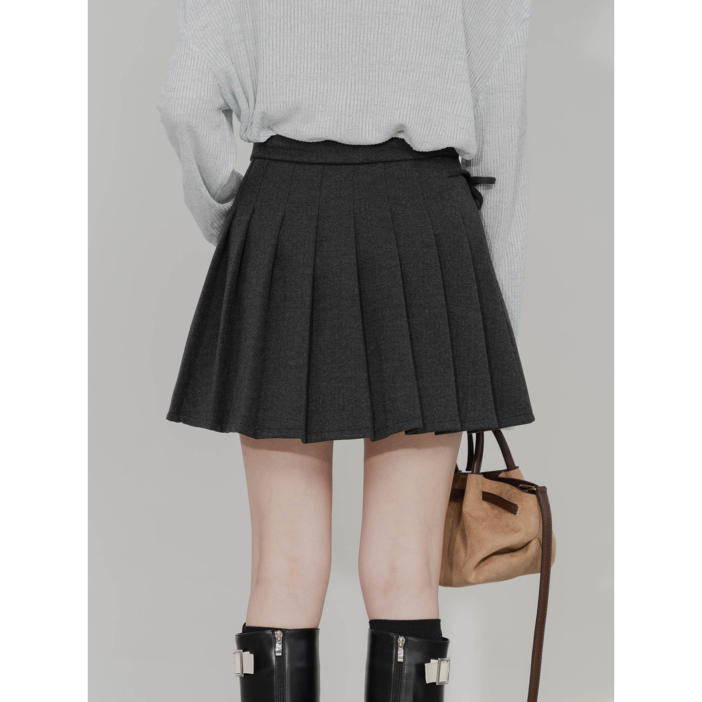 不对称设计修身绑带毛呢百褶短裙